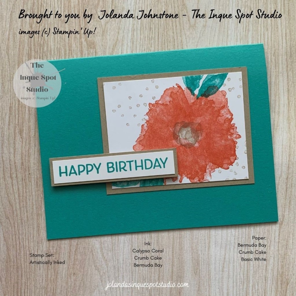I wanted to create a #simplestamping card that fell within the clean and simple (CAS) category. To wit, I flipped the TGIF Sketch 90 degrees to accommodate the longer sentiment with in the Artistically Inked stamp set. The theme of flowers and the three colors, Calypso Coral, Bermuda Bay and Crumb Cake were my take-aways from the JAI photo.