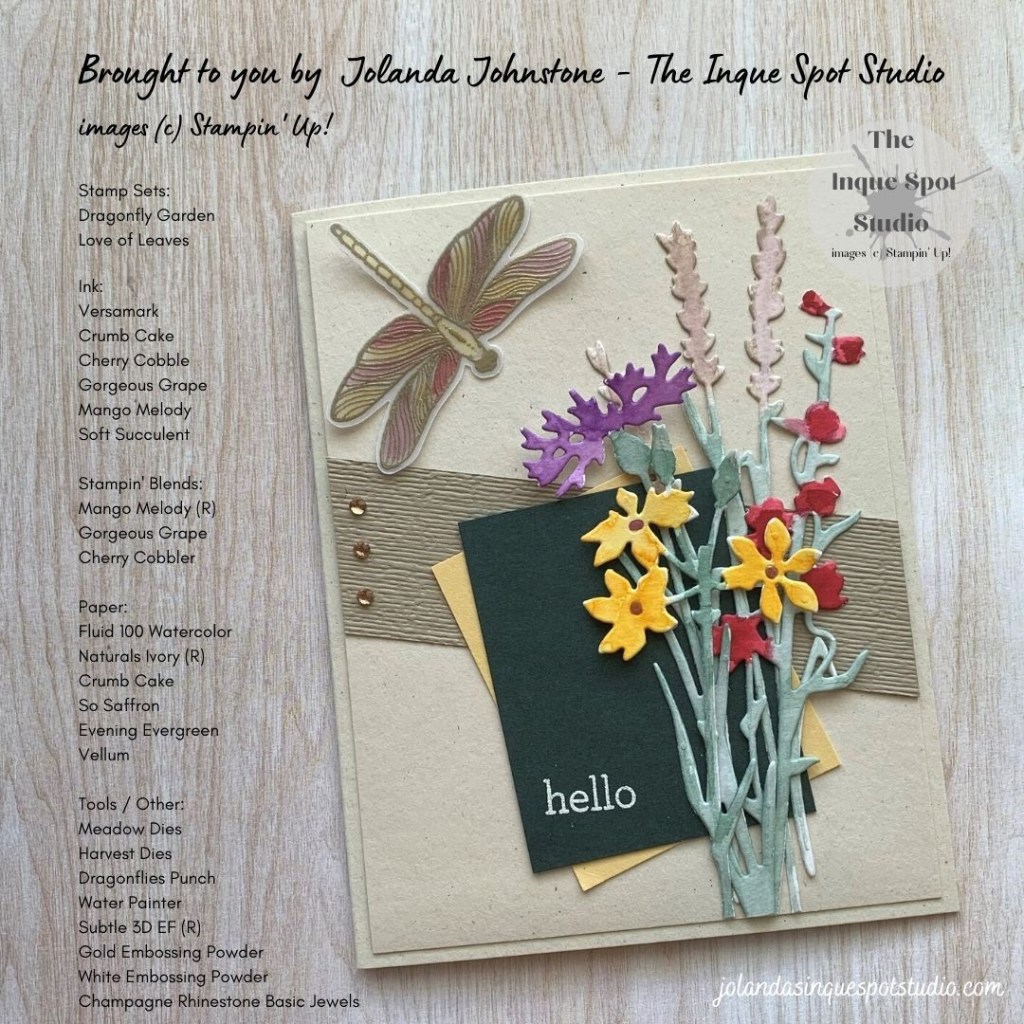 - The Dragonfly, from the Dragonfly Garden stamp set was stamped with Versamark ink and stamped onto a piece of Vellum. The Dragonfly was then heat-set with Gold Embossing Powder. To keep the Dragonfly Wings translucent, the Wings were colored from the back with the Cherry Cobbler, Gorgeous Grape and retired Mango Melody Stampin’ Blends. The Dragonfly was then punched out using the coordinating Dragonflies Punch.