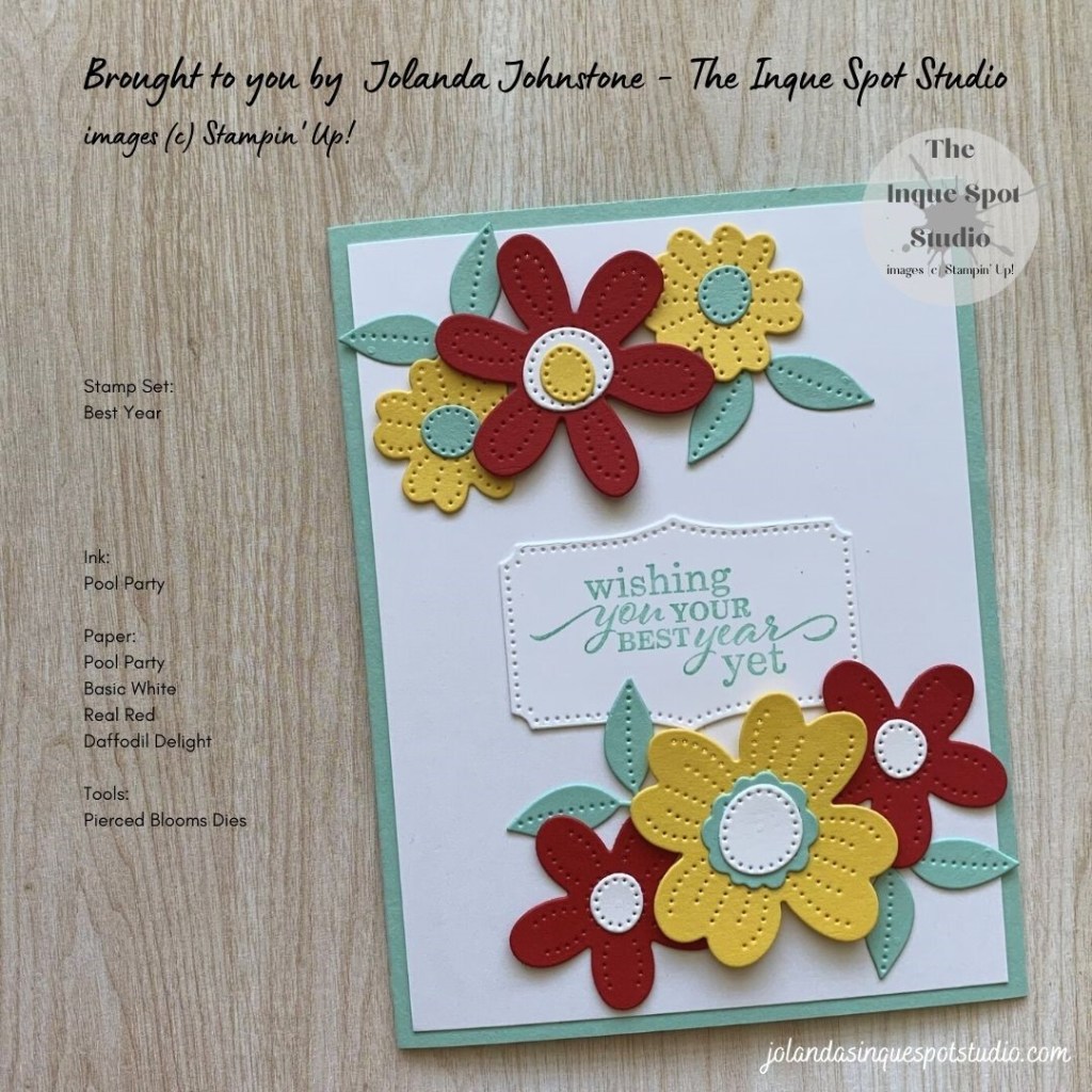 The sentiment, Wishing you your best year yet, from the Best Year stamp set was stamped onto a scrap piece of Basic White cardstock with Pool Party ink and then die cut.