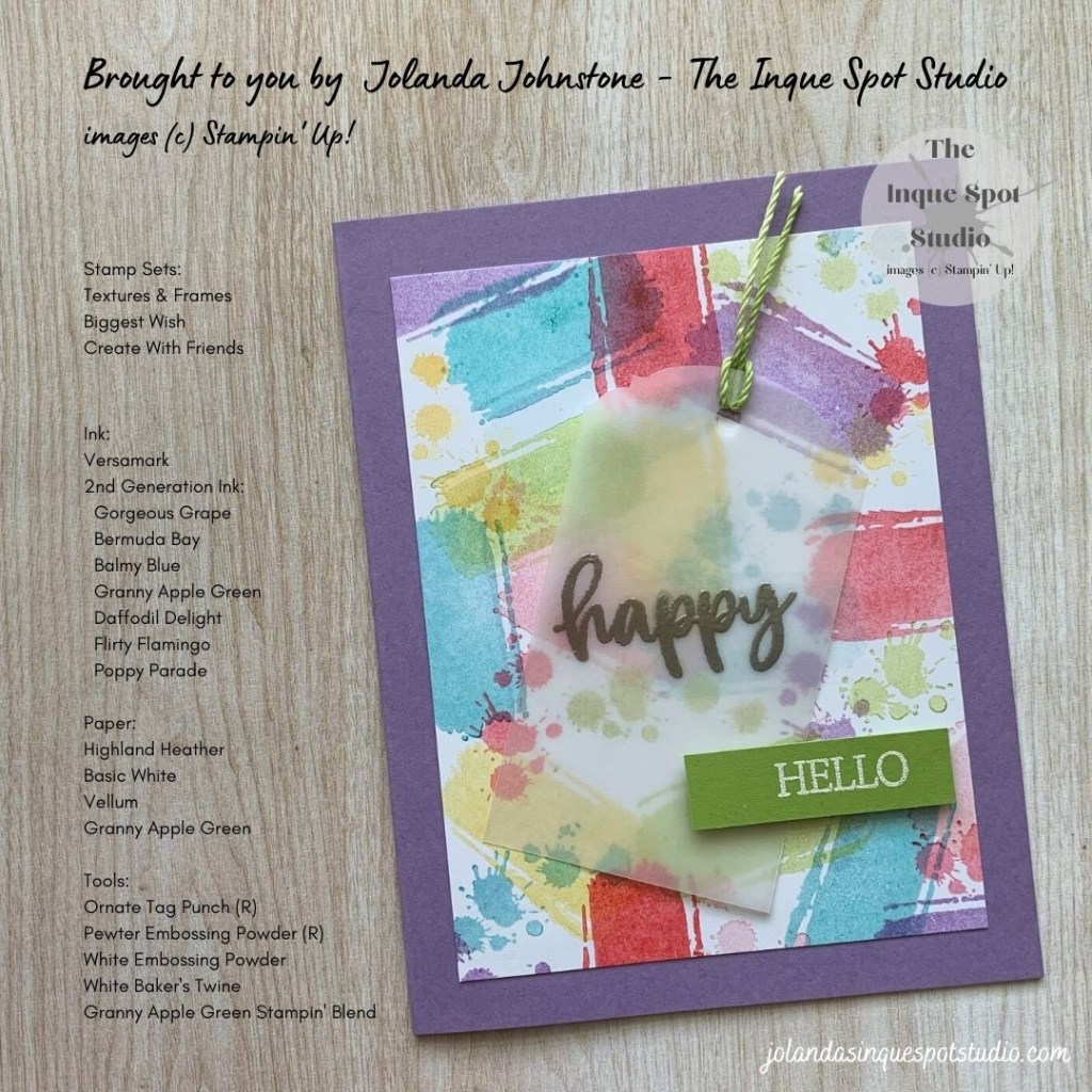 - For the slanted rectangle shape, I chose to create a Vellum tag (2” x 3½”) using one of the Tag Topper Punches I had on hand, in this case, the retired Ornate Tag Punch. I chose Vellum because I did not want to cover up the patterned paper I created. I stamped the word, happy, from the Biggest Wish stamp set with Versamark ink and heat-set it with retired Pewter Embossing Powder because I wanted a “Gray” tone. Silver Embossing Powder would have worked just as well. I also colored a piece of White Baker’s Twine (5″) with the Granny Apple Green Stampin’ Blend. I added a little Isopropyl Alcohol to the twine to mute the brightness of the color. The Twine was then looped through the hole to finish off the Tag.
