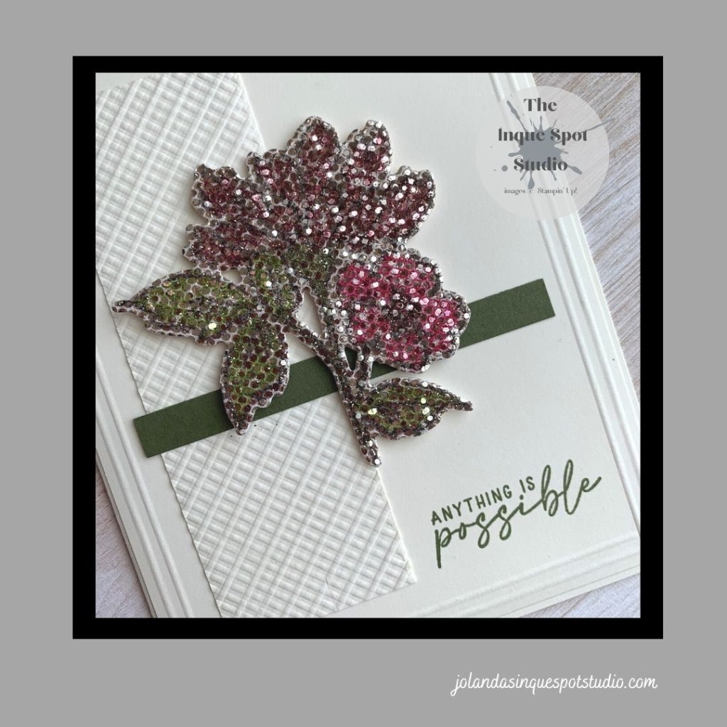 - The Be Dazzling Designer Series Paper can be colored. Here I colored the Floral image with a variety of Stampin’ Blends: Stem – Mossy Meadow, Leaves – Granny Apple Green, Small Flower – Polished Pink and Large Flower – Rich Razzleberry. Colored Glitter? Who could ask for anything more!