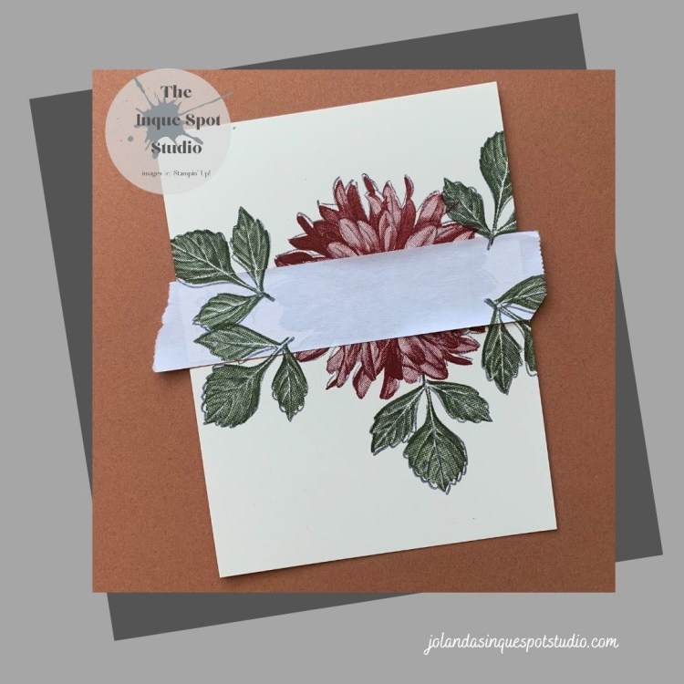 • For the Cross Strip element, I used a Mask.  To continue the illusion that the Dahlia is bursting forth and remains the focal point, I used the (1”) wide Repositionable Tape and Masked the area I wanted to be ink free.