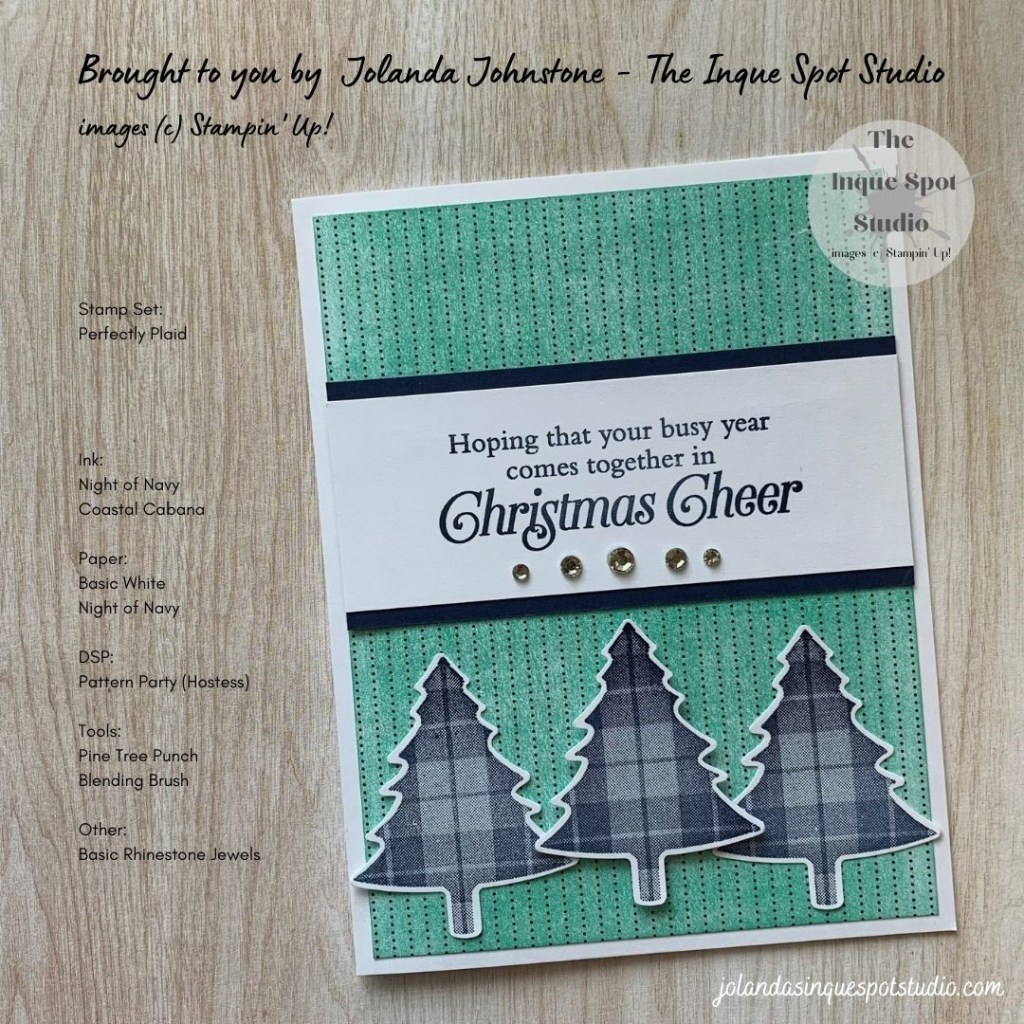 - Christmas Trees: (1⅝” x 2”) Basic White cardstock scraps. The Plaid Tree, from the Perfectly Plaid stamp set, was stamped three times with Night of Navy ink and punched out with the coordinating Pine Tree Punch.
