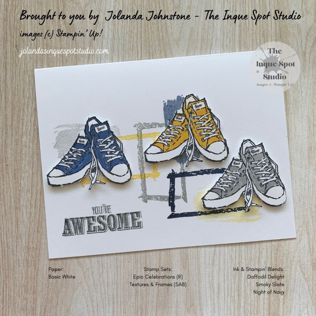 - For the Focal image(s), I stamped the Sneakers from the same stamp set, Epic Celebrations, three times with Memento Tuxedo Black ink and colored them with Stampin’ Blends in the same three colors. The Sneakers were fussy cut with Paper Snips and popped up over the stamped background shapes with Dimensionals.