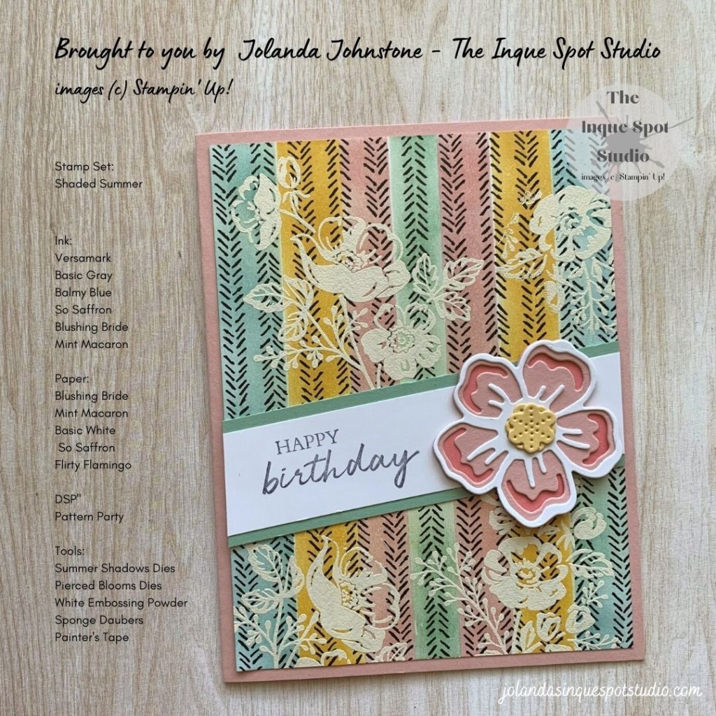 I love how you have stamped and embossed on the striped background paper Jolanda. I love how it adds interest, texture and a tactile element to your card. Chantell Just Add Ink