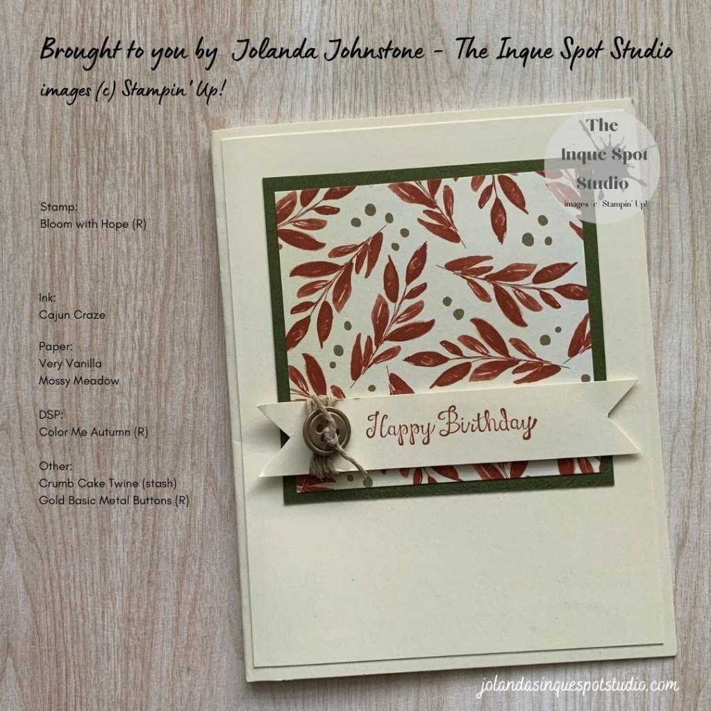 - Sentiment Flag: (3¾” x ¾”) Very Vanilla cardstock scrap. The sentiment, Happy Birthday, from the retired Bloom with Hope stamp set was stamped with Cajun Craze ink. I liked the font and it paired up nicely with the swaying Leaves in the patterned paper. The ends of the label were hand-flagged with Paper Snips.