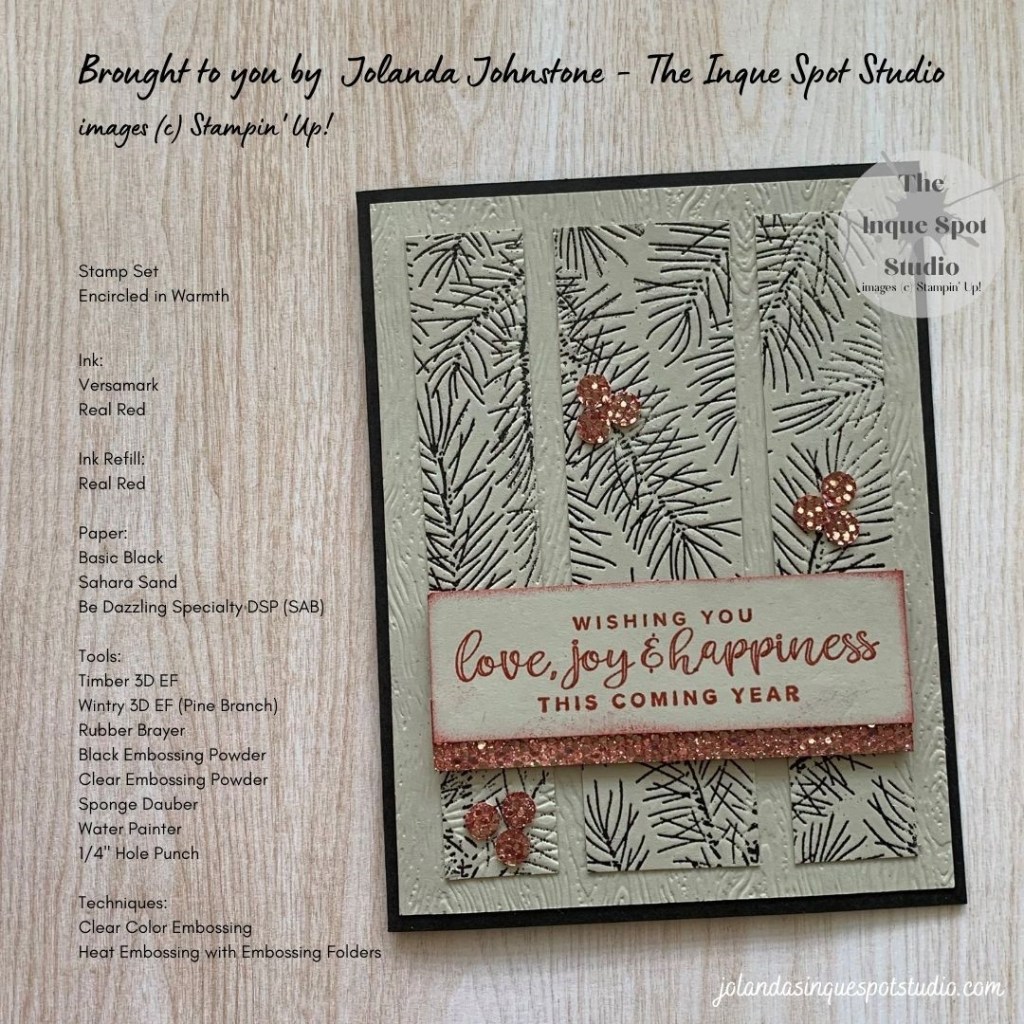 - Sentiment Label: (3¼” x 1⅛”) Sahara Sand cardstock. The sentiment, …Love, Joy and Happiness…, from the Encircled in Warmth stamp set was inked with Versamark ink and then again with Real Red ink and stamped on to the label. The sentiment was heat-set with Clear Embossing Powder. To set the label apart from the background the edges were sponged with Real Red ink using a Sponge Dauber.