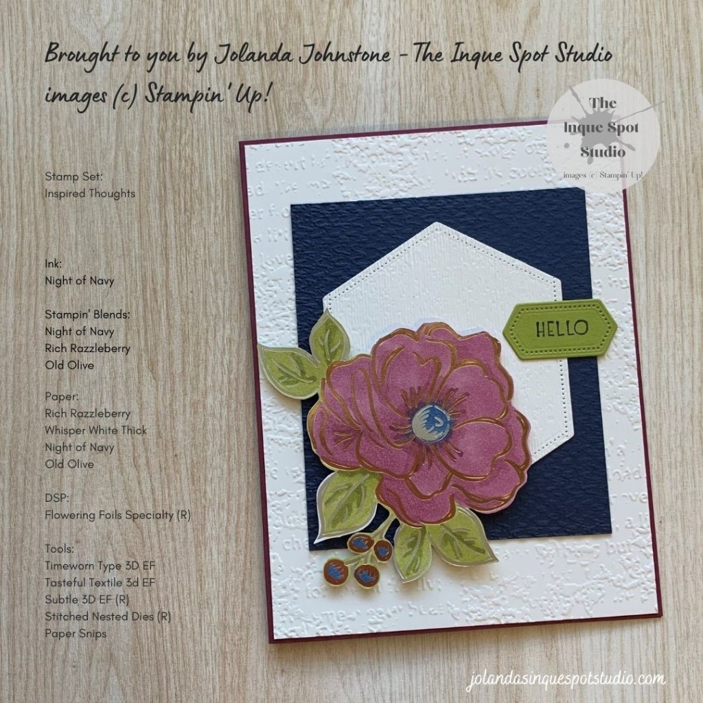 - Toe: Metallic – Silver and Gold Foiled Floral image. The Flower was colored with the Night of Navy, Rich Razzleberry and Old Olive Stampin’ Blends.