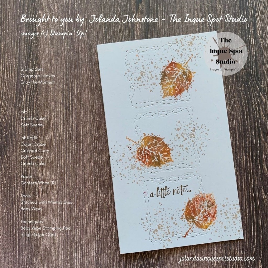 - Stamped Images – Leaves: Using the Baby Wipe Stamping Technique, Classic Ink Refill drops of Cajun Craze, Crushed Curry, Soft Suede and Crumb Cake were added to a folded baby wipe. The Leaf from the Gorgeous Leaves stamp set was stamped in each of the squares resulting in the variegated coloring.