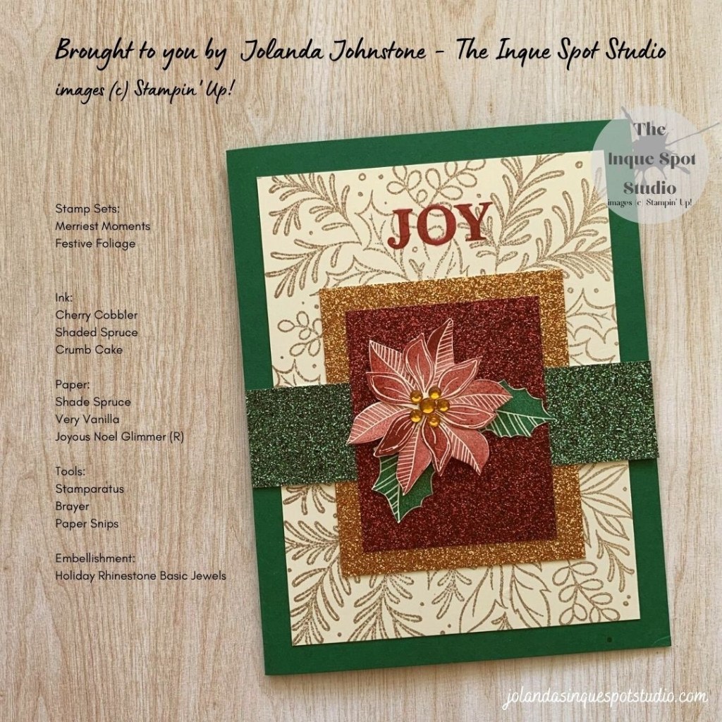 - Background Panel: (3⅝” x 4⅞”) Very Vanilla cardstock. Using the Stamparatus Positioning Tool, the panel was decorated with the Festive Foliage background stamp. Crumb Cake ink was added to the stamp with a Brayer. The sentiment, Joy, from the Merriest Moments stamp set was stamped with Cherry Cobbler ink centered at the top of the panel.