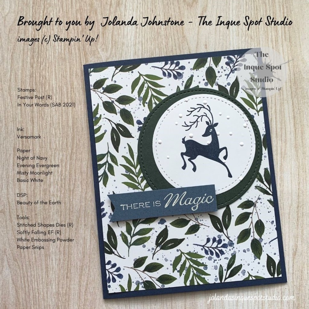 - Sentiment Flag: (2½” x ⅝”) Misty Moonlight cardstock. The truncated sentiment, There is Magic, from the 2021 Sale-a-bration Hostess In Your Words stamp set was stamped with Versamark ink and heat-set with White Embossing Powder. The Flag was hand-snipped with Paper Snips.