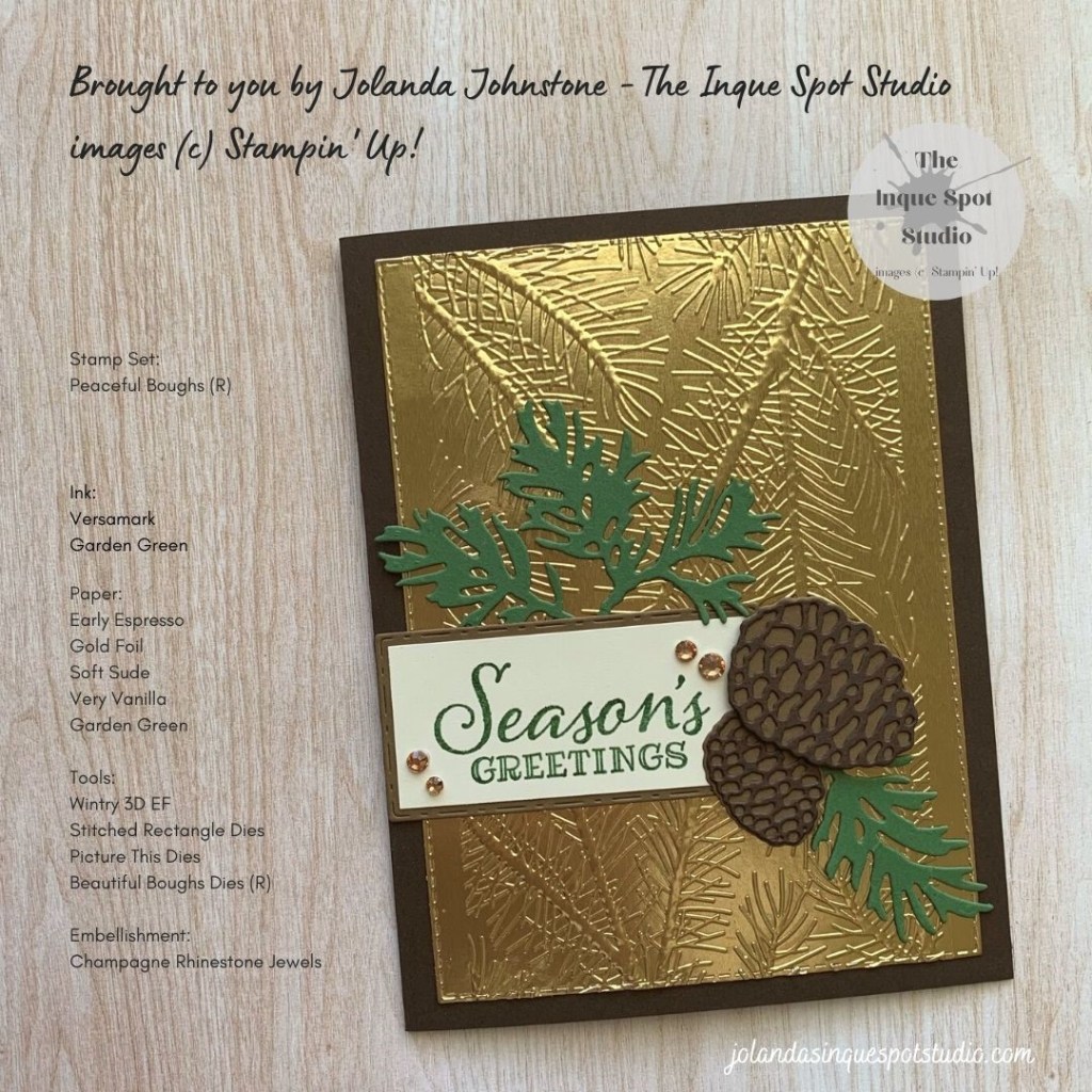 Challenge: TTTC137 * Tic – Sparkle (Champagne Rhinestone Basic Jewels); Tac – Embossing (Wintry 3D Embossing Folder); and Toe – Any Shape Die (Beautiful Boughs Dies)