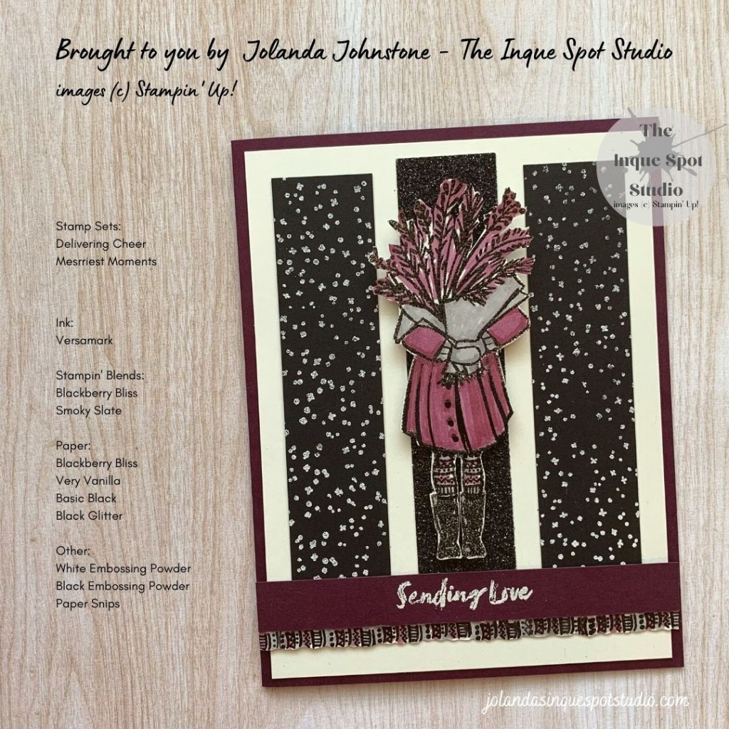 Over at the Stampin’ Up! Only Challenges (#287), the request was to use favorite products from the Holiday Mini Catalog. I chose the stamp sets Delivering Cheer and Merriest Moments along with Black Glitter Paper.
