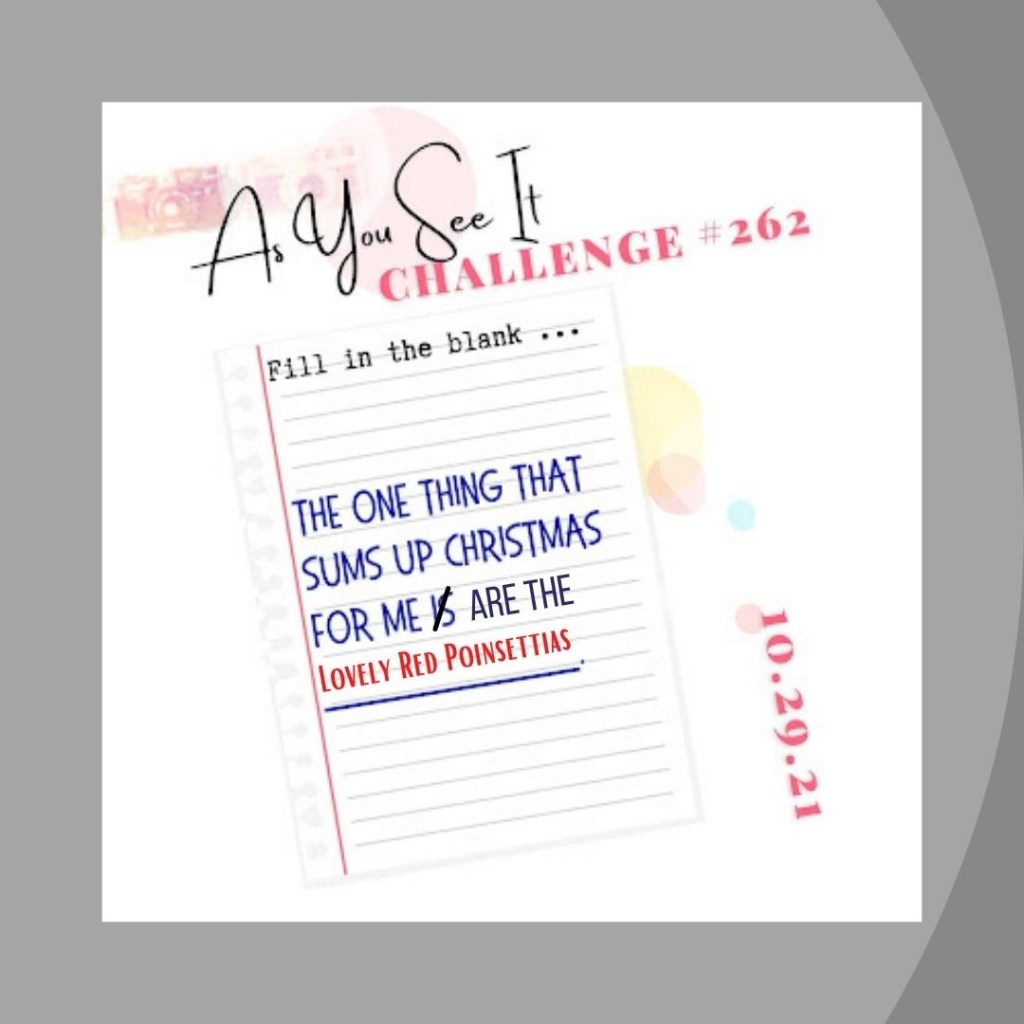 Poinsettias are indeed synonymous with Christmas, Jolanda, and I love how you’ve portrayed them in your card! The texture of the top panel and the graphic crispness of the stamped designs, along with the varied shades of red and green were my favourite things about your design. Thanks for filling in the blank with us at As You See It Challenges!