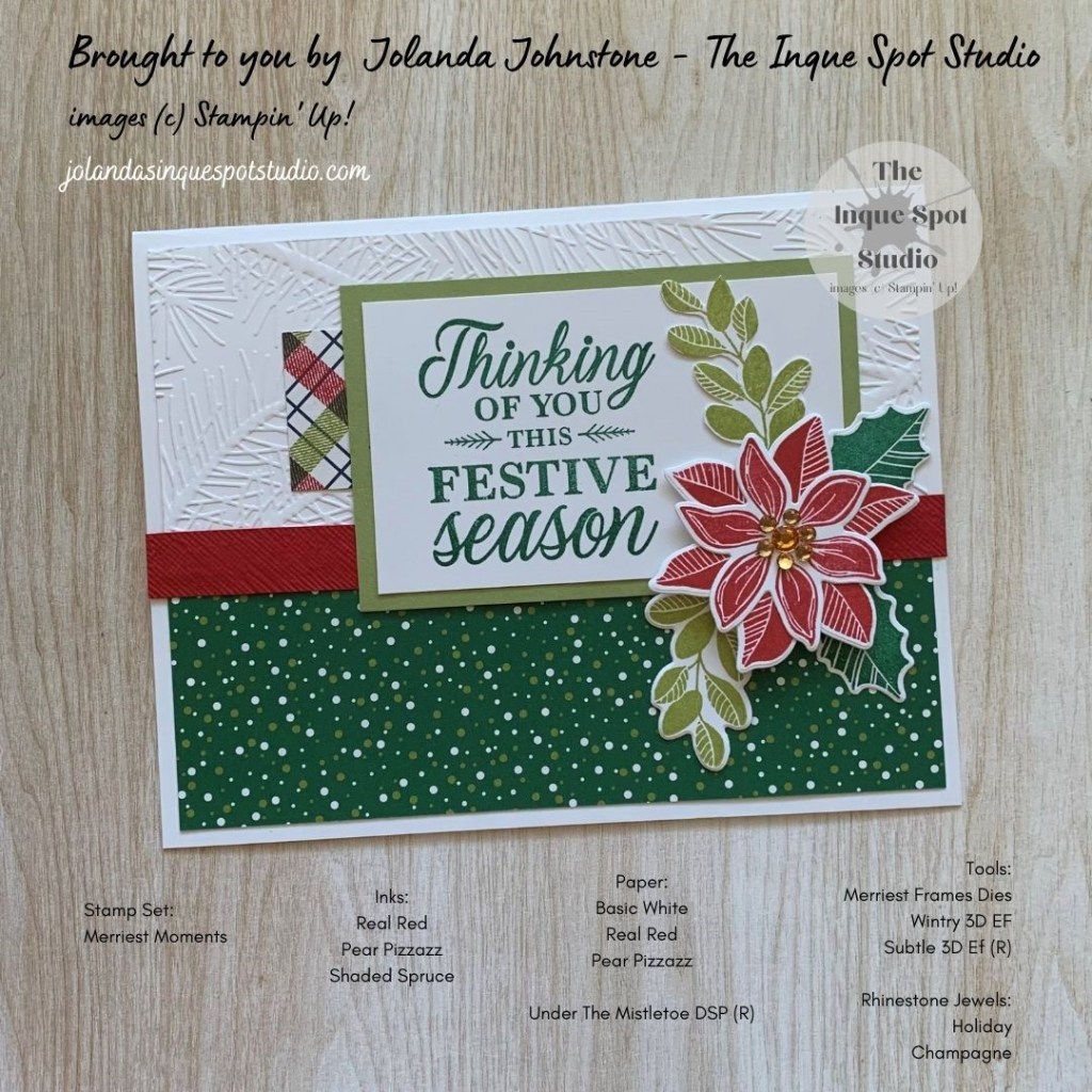 - Shapes – Focal Image: Basic White cardstock. The two Poinsettia images were stamped with Real Red ink, The Holly Leaves were stamped with Shaded Spruce ink and the Leaf Spray was stamped with Pear Pizzazz ink. All of the images were die-cut with the coordinating dies from the Merriest Frames Dies set.