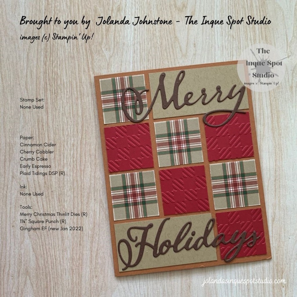 - Block Pattern: Crumb Cake and Cherry Cobbler cardstock and the Cherry Cobbler, Garden Green, Crumb Cake and Whisper White patterned piece of paper from the retired Plaid Tidings Designer Series Paper pack.