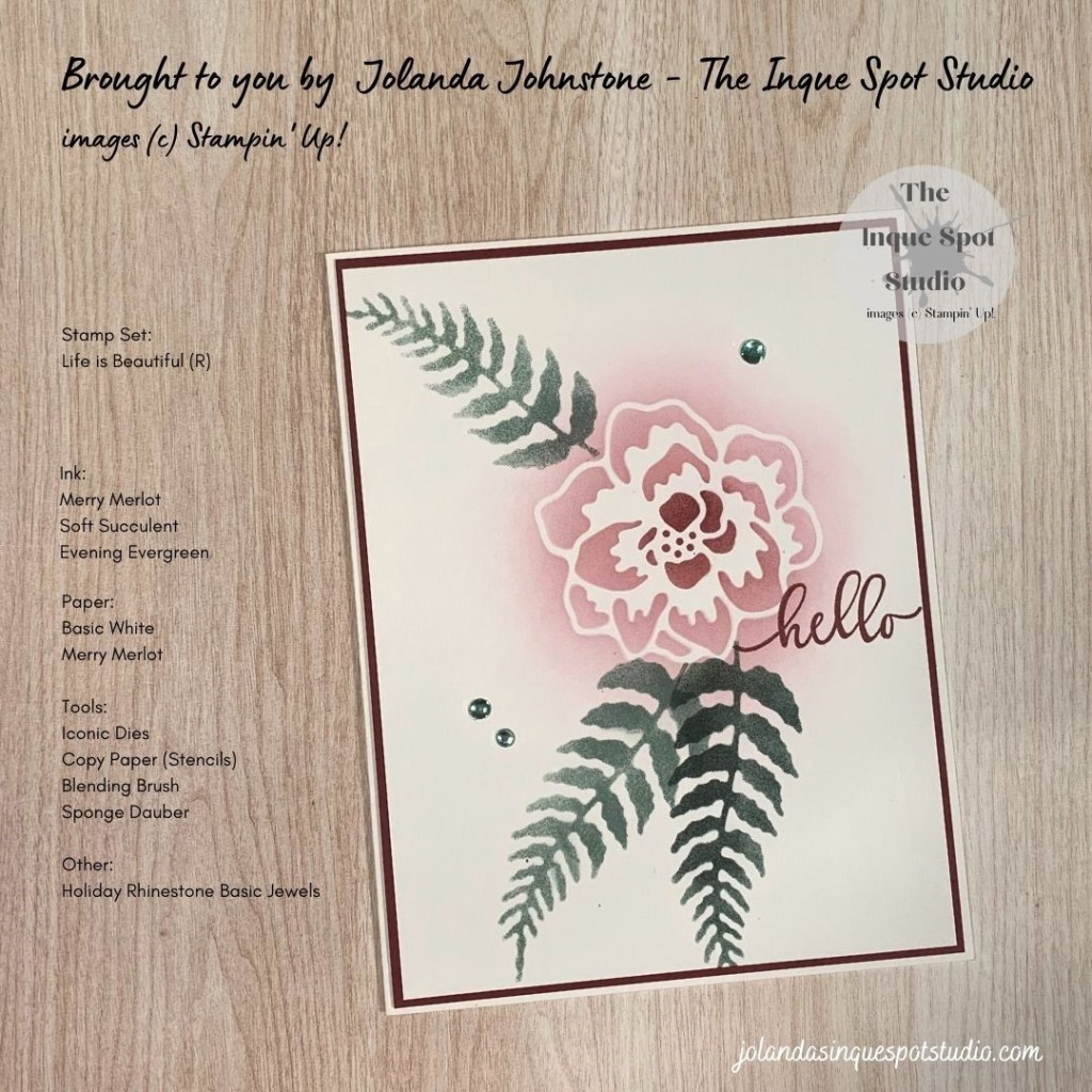 - Using a Blending Brush, I added Merry Merlot ink over the Floral Stencil resulting in the White Rose.