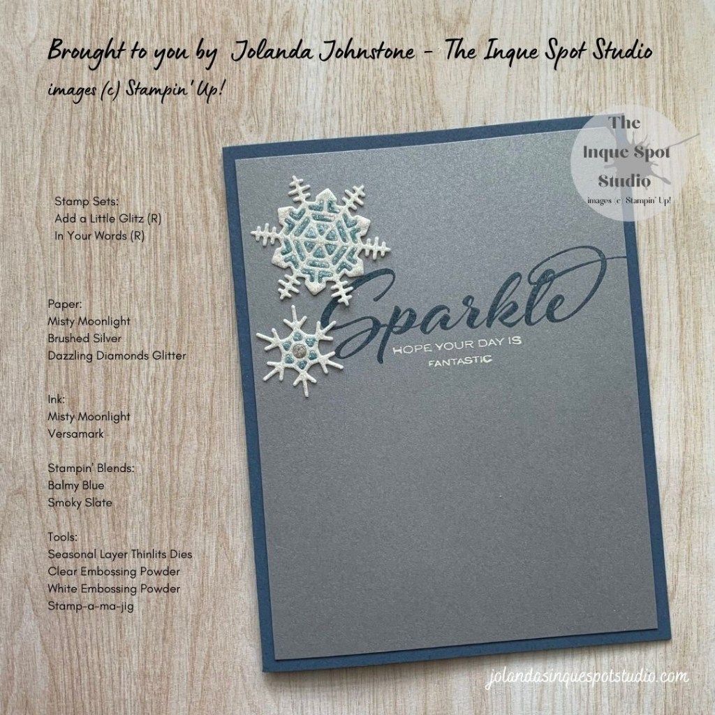 - The word, Sparkle, from the retired Add a Little Glitz stamp set was stamped with Versamark ink and then again in Misty Moonlight ink and heat-set with Clear Embossing Powder. The phrase, May Your Season, was masked with a sliver of scotch tape before inking.