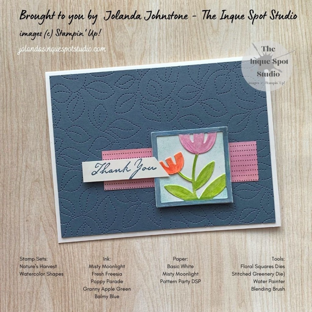 • Foreground: The Floral image was die-cut with one of the dies from the Floral Squares Dies set.  The image was then water-colored with Fresh Freesia, Poppy Parade, Granny Apple Green and Misty Moonlight inks and the Fine-Tipped Water Painter Brush.