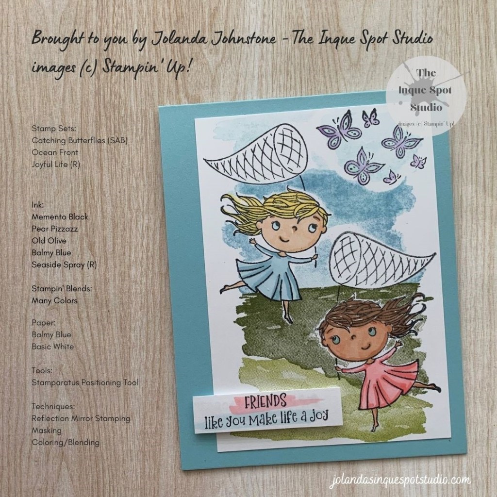 • The sentiment, Friends like you make life a joy, from the retired Joyful Life stamp set was chosen in lieu of the sentiments in the Chasing Butterflies stamp set as it was a more appropriate sentiment for the two Girls having fun together.