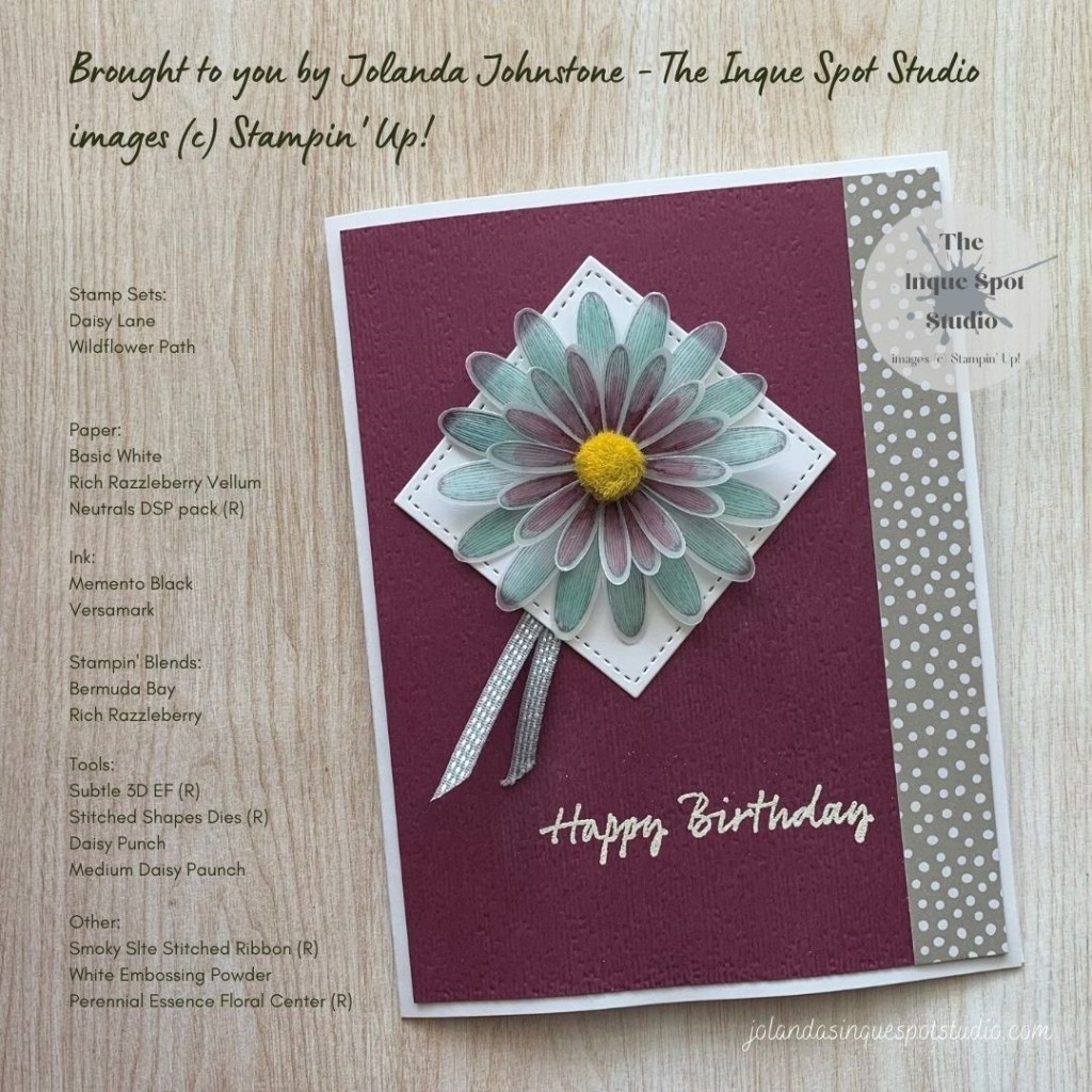 • The sentiment, Happy Birthday, from the Wildflower Path stamp set was stamped with Versamark ink and heat-set with White Embossing Powder.
