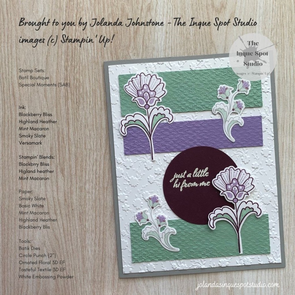 - The larger Floral images from the Batik Boutique stamp set were stamped with Blackberry Bliss ink and with the coordinating in-fill stamps, Highland Heather ink was added to the Flowers and Mint Macaron was added to the Leaves.
