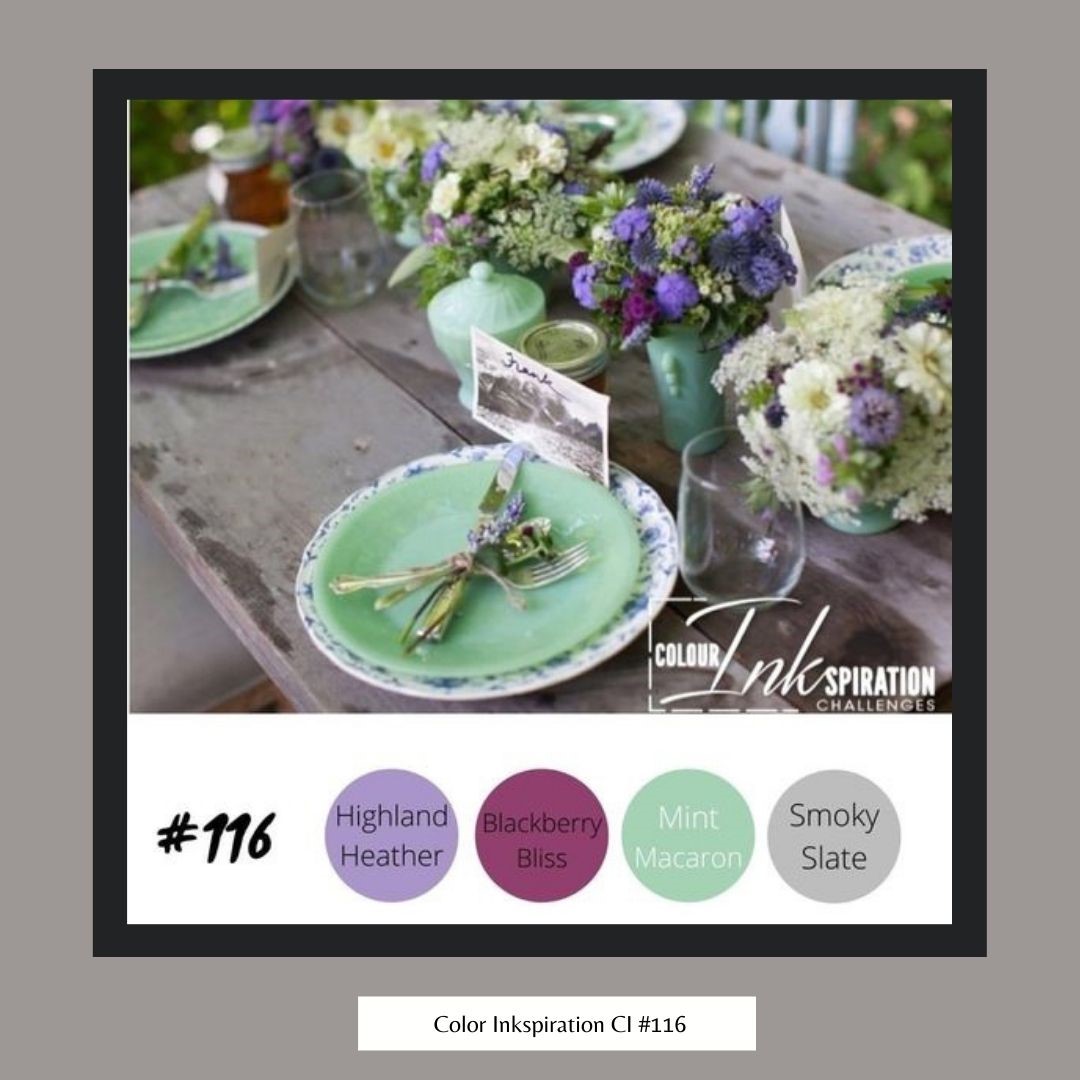 - The smaller Floral images from the same stamp set were stamped with Smoky Slate ink and colored with Stampin’ Blends; Light Highland Heather, Mint Macaron and Blackberry Bliss.