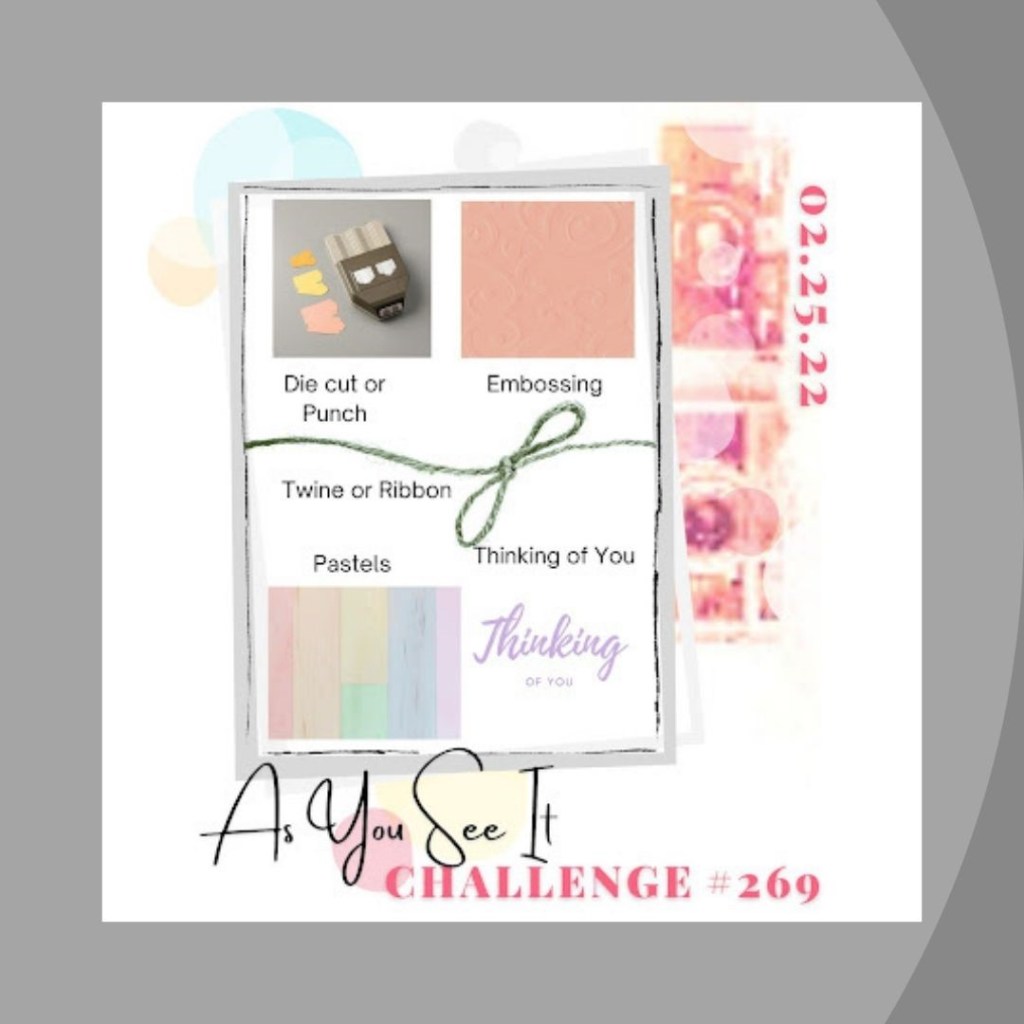 Sketch: The Paper Players (#580); Tools: TGIF (#357); Colors / Theme / Tools: Tic Tac Toe (#150) and a Recipe from As You See It (#269) to use all of the elements: Die Cuts / Twine / Textured Embossing / Pastel Colors and the sentiment, Thinking of You.