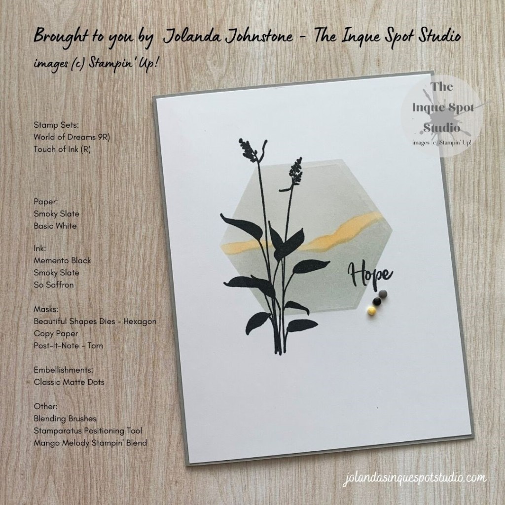 - Using the Stamparatus Positioning Tool and Memento Tuxedo Black ink, the Silhouette Plant image from the retired World of Dreams (circa 2014) stamp set and the word, Hope, from the retired Touch of Ink (circa 2021) stamp set were added. The Stamparatus was used to ensure that the “black” was solidly applied.