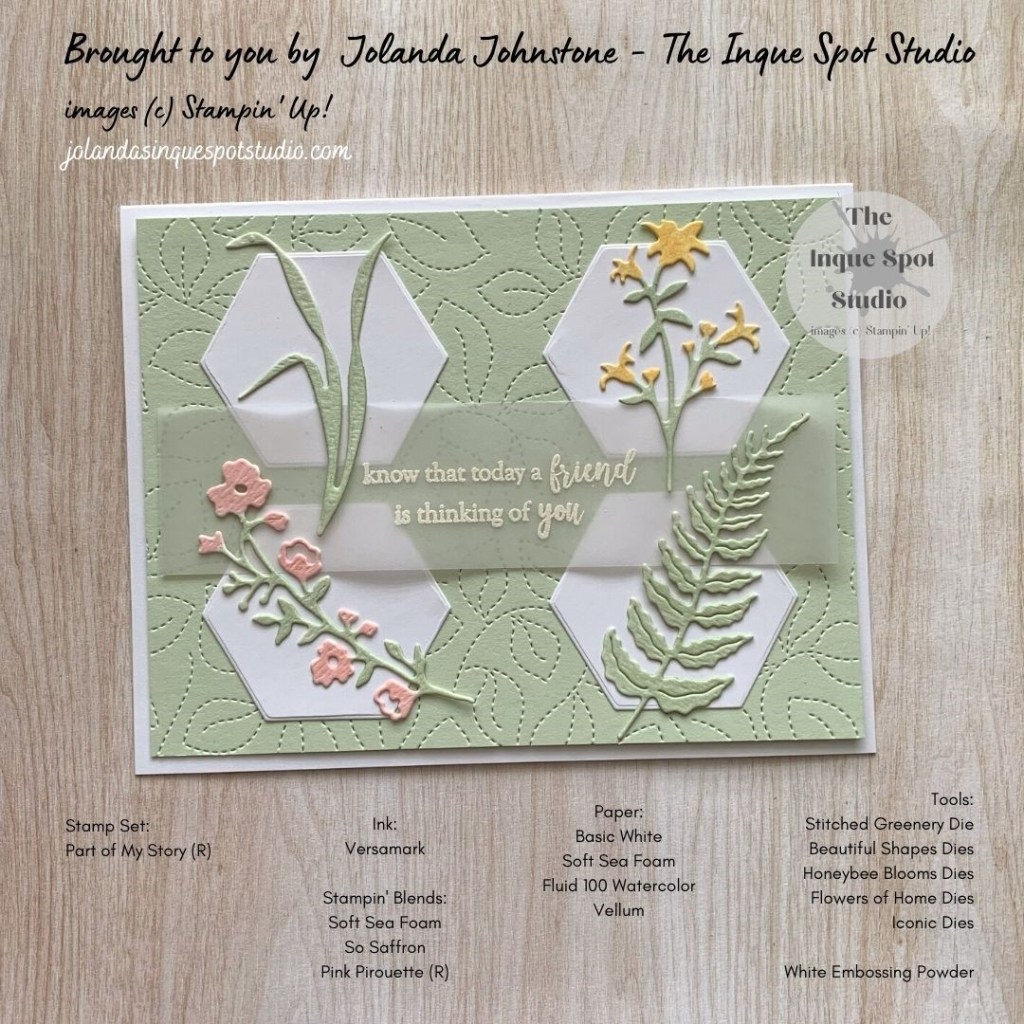 - The sentiment, know that today a friend is thinking of you, from the retired Part of My Story stamp set was stamped with Versamark ink and heat-set with White Embossing Powder. This is a nice subtle sympathy sentiment yet it can work for many other occasions too.