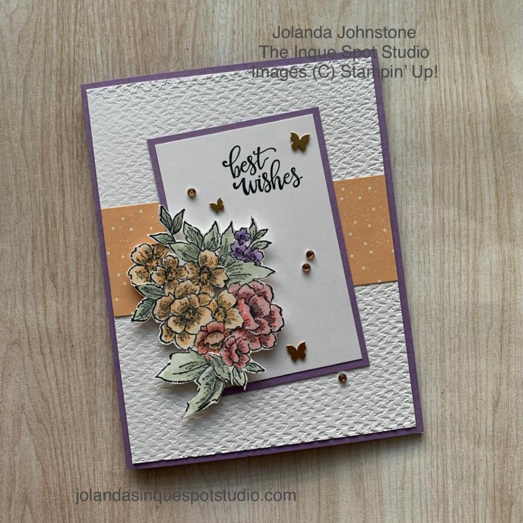 - The sentiment, Best Wishes, from the Artistically Inked stamp set was stamped in the right top corner with Memento Tuxedo Black ink.
