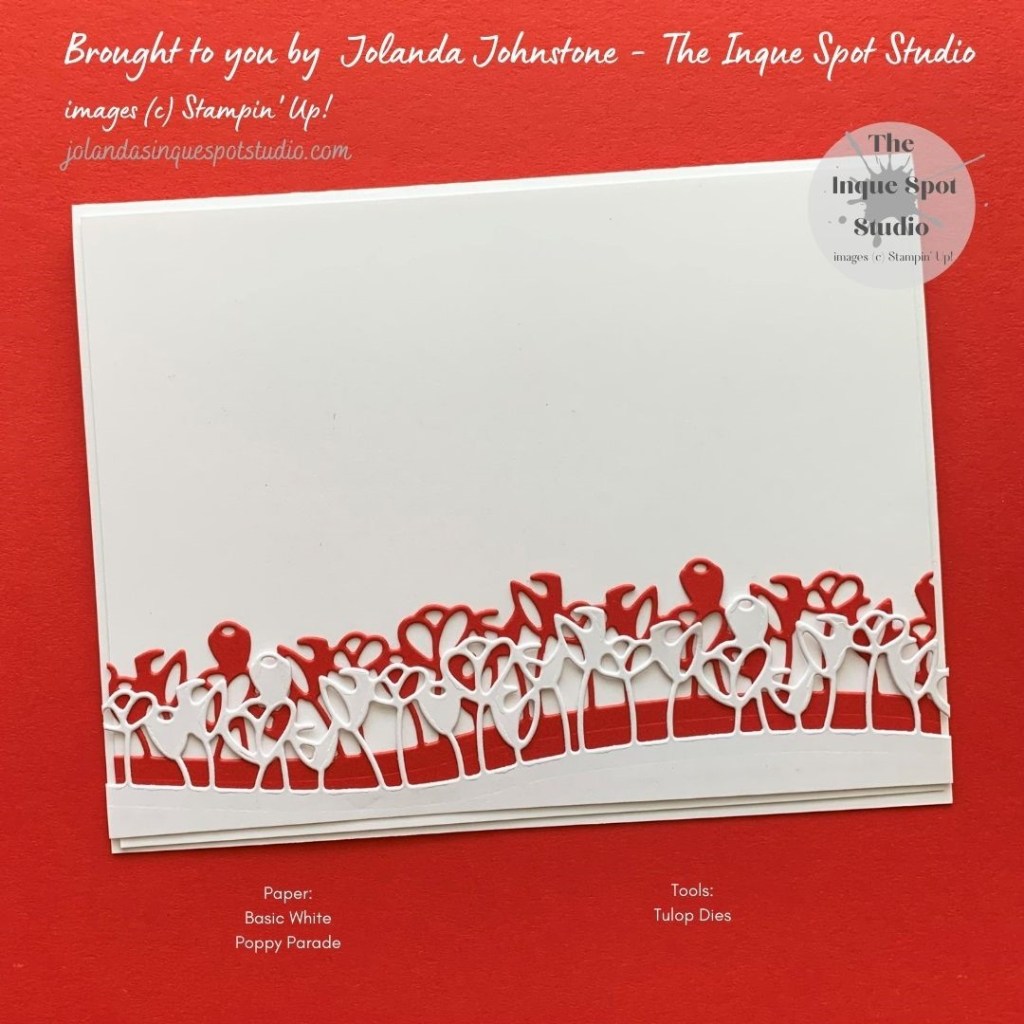 - Focal Image – Tulips: (5½” x 1⅜”) Basic White and Poppy Parade cardstock die-cut with the landscape strip of tulips die from the Tulips Dies set.