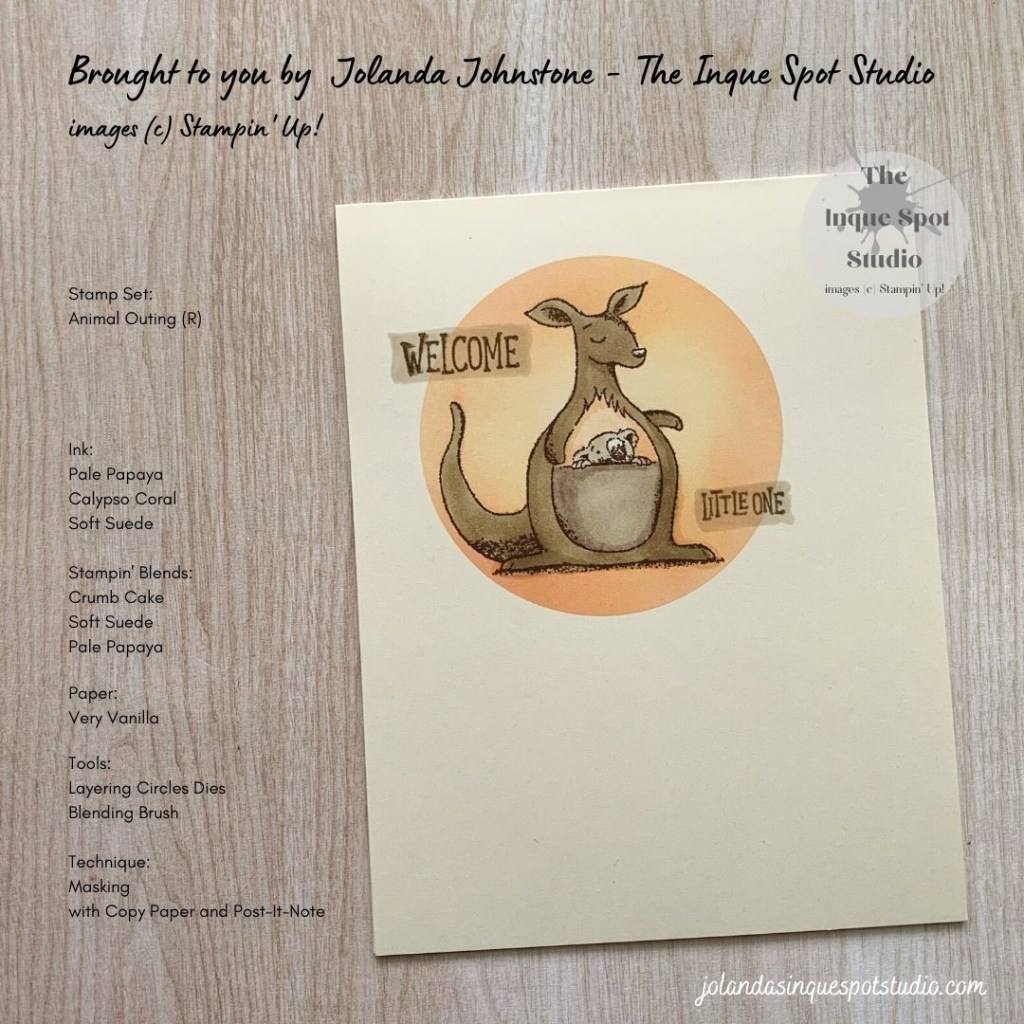 - Step 8: The Kangaroo and Joey image was colored with Stampin’ Blends. Mama – Light Soft Suede (Body), Light Crumb Cake (Pouch), and Light Pale Papaya (Belly). Joey – Light Crumb Cake.