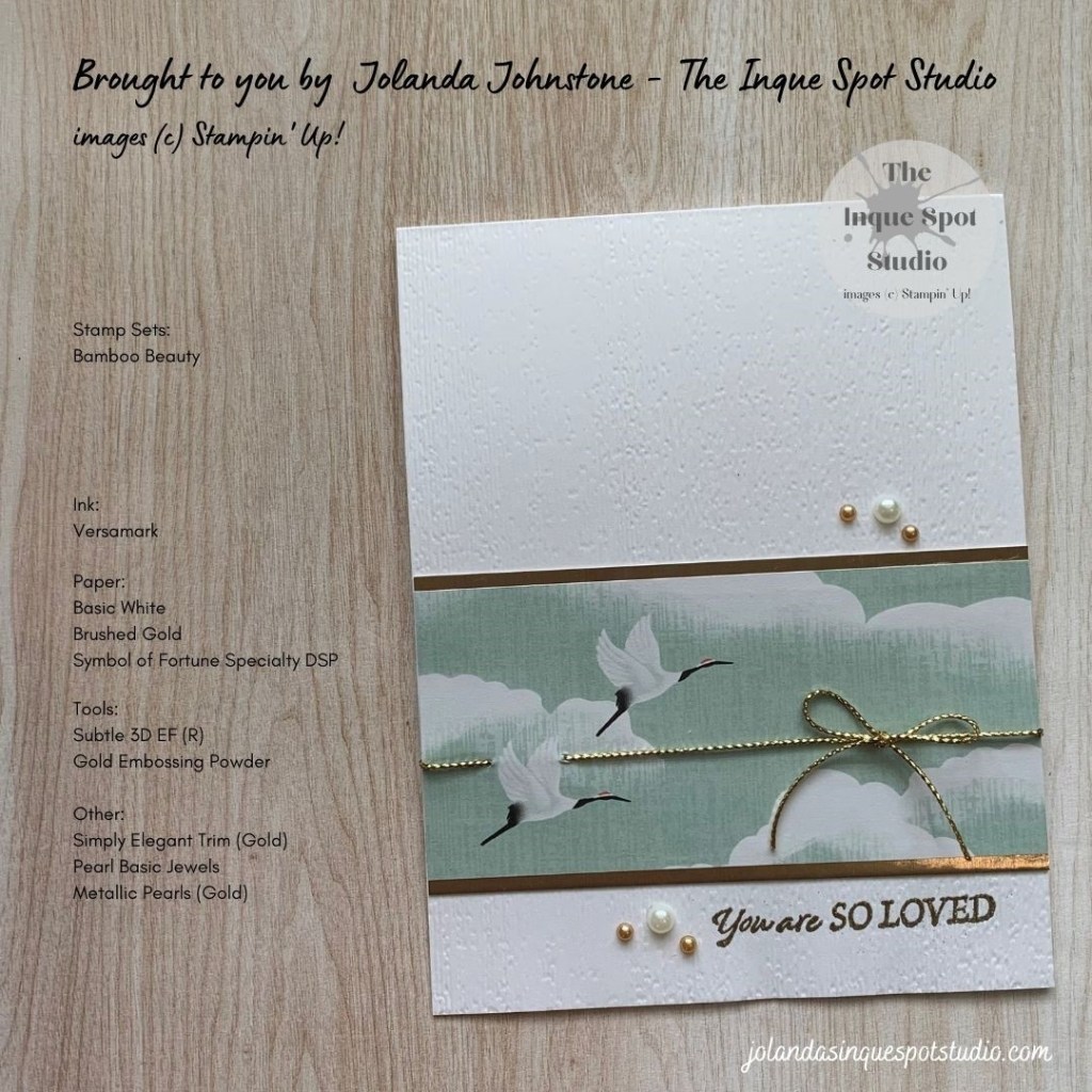 - The sentiment, You Are So Loved, from the Bamboo Beauty stamp set was stamped with Versamark and heat-set with Gold Embossing Powder.