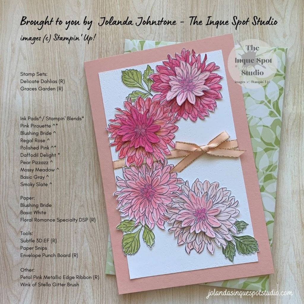 - Depth and Highlights were added to the Dahlias with Stampin’ Blends: Pink Pirouette (R), Polished Pink and Daffodil Delight.