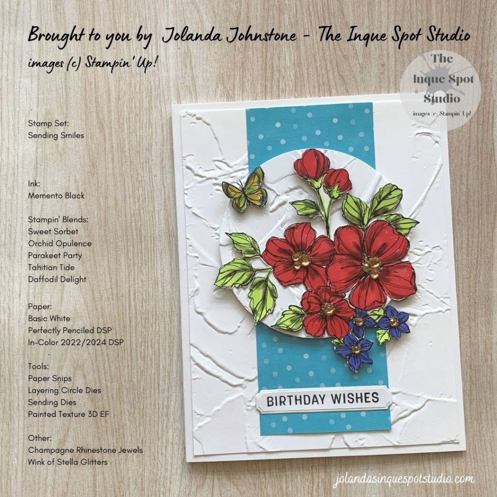 - The Flowers and Butterfly were colored with Stampin’ Blends. Large Blossoms – Sweet Sorbet, Small Blossoms – Orchid Opulence, Leaves – Parakeet Party, Floral Centers – Daffodil Delight, and Butterfly – Daffodil Delight and Tahitian Tide.