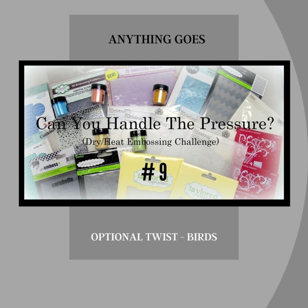 How very clever to do the positive and negative of that die cut bird image. I LOVE this design and your colors are fabulous. Lots of wonderful work here, and great take on the challenge. Thanks so much for playing along over at the Can You Handle the Pressure Challenge, hope to see you back again soon!!