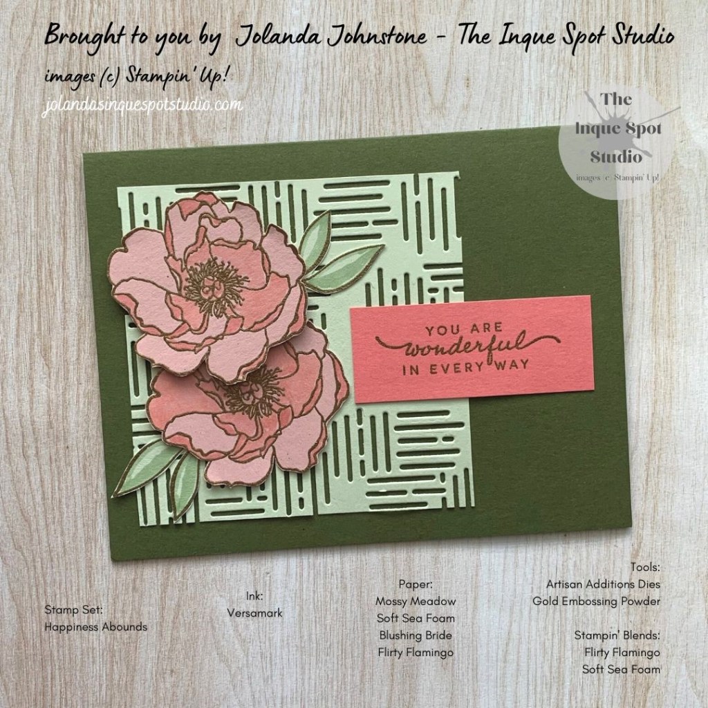 - The sentiment, You are wonderful in every way, from the Happiness Abounds stamp set was stamped with Versamark and heat-set with Gold Embossing Powder.