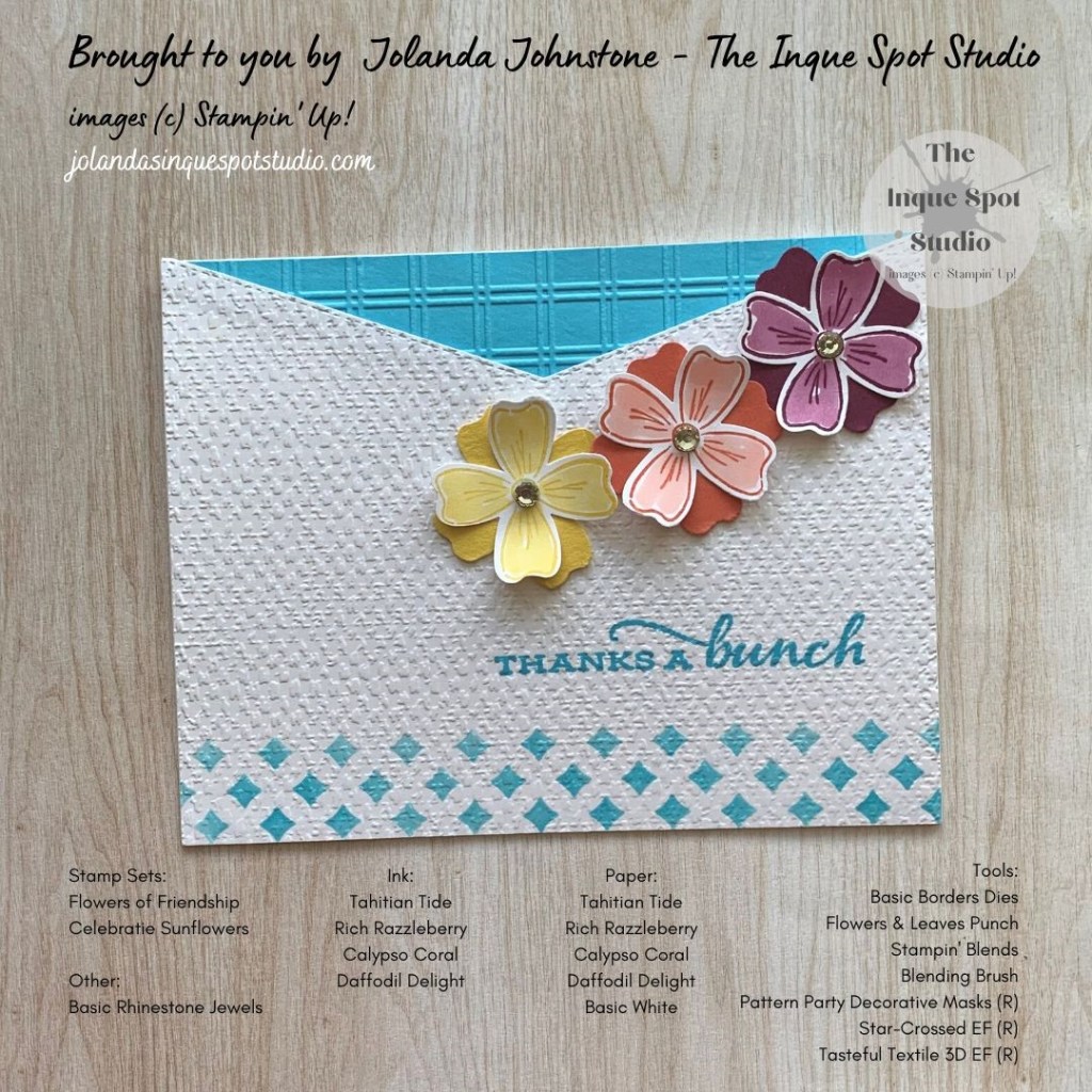 The Tahitian Tide Envelope Accent was adhered to the top of the Basic White card base. The Basic White Background Panel was then added followed by the stacked Flowers. For a little added bling, the center of each Flower sports a Basic Rhinestone Jewel.