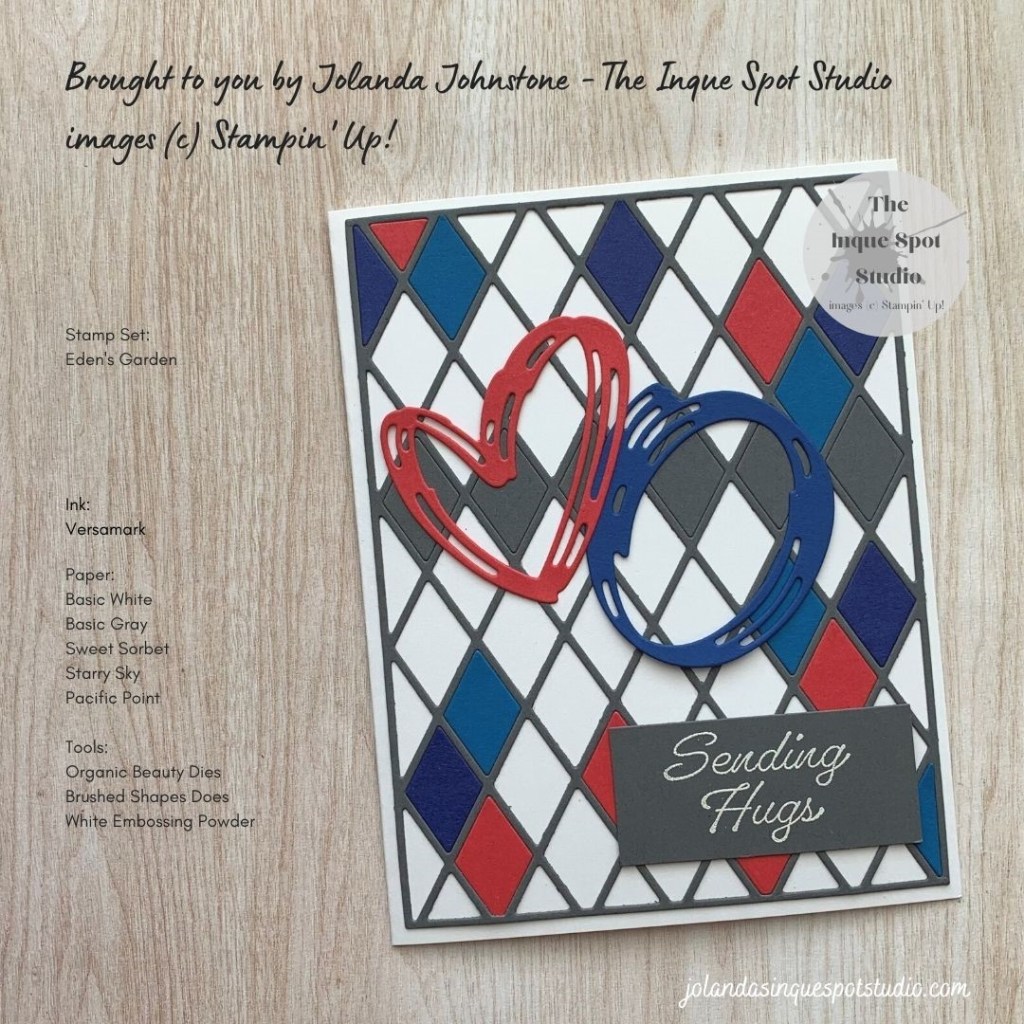 - The sentiment, Sending Hugs, from the Eden’s Garden stamp set was stamped with Versamark ink and heat-set with White Embossing Powder.