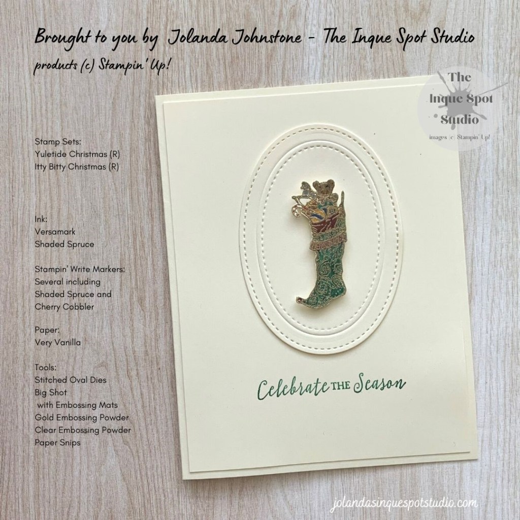 - Originally, the cute Christmas Stocking image from the retired Yuletide Christmas stamp set was stamped with Versamark ink and heat-set with Gold Embossing Powder on the card front.