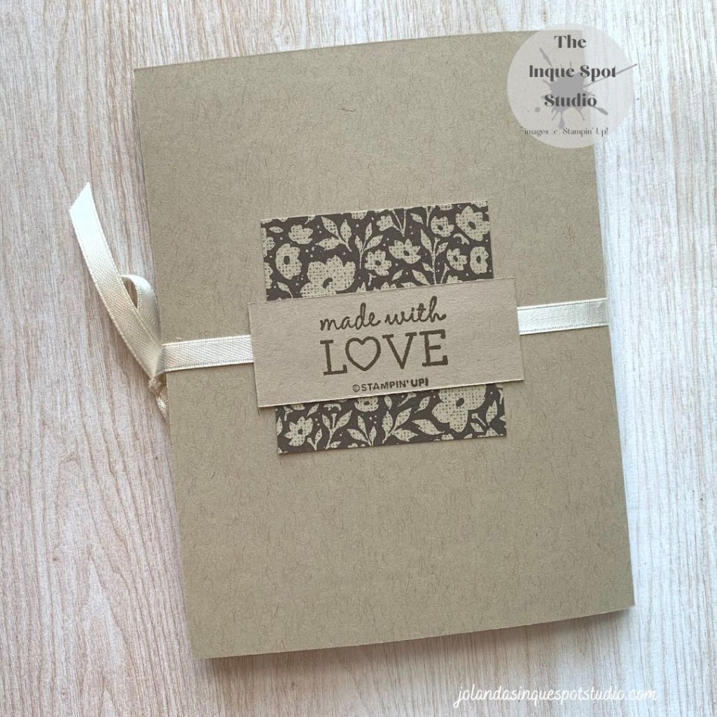 • A (2” x 1”) piece of Crumb Cake cardstock scrap was stamped with the Made with Love, sentiment from the Limited Edition stamp set using Soft Suede ink.