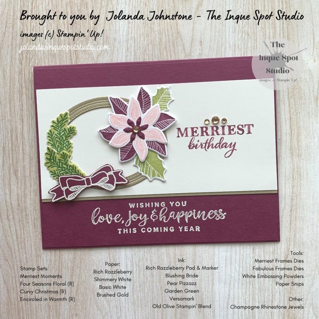 The Poinsettia Flower was assembled and then added to the Oval Frame along with the Pine Bough pieces and the Bow. All of the elements were then attached to the card base and the Flower and the Bow were popped up with Dimensionals. For a little extra birthday / holiday bling, I added Champagne Rhinestone Jewels to the Flower Center and the Birthday Sentiment.