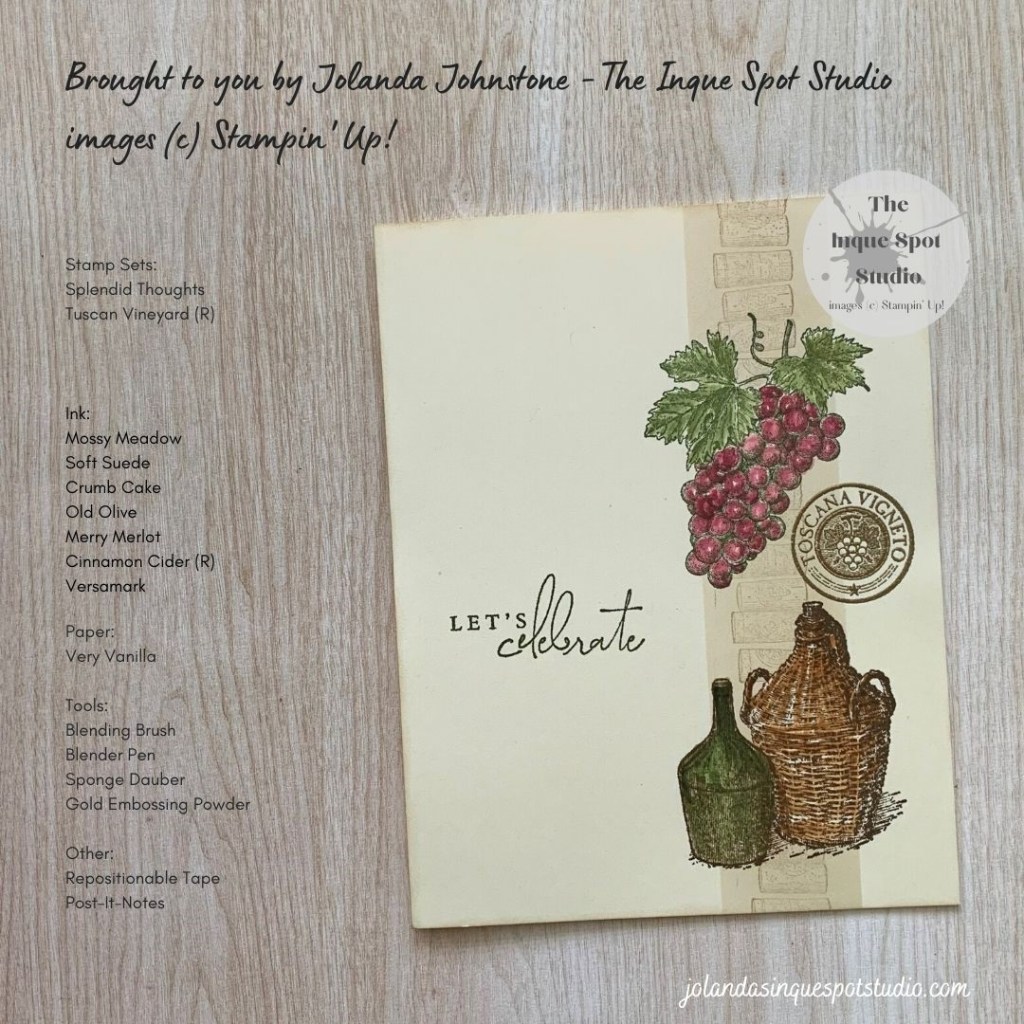 The challenge theme for the FUSION sketch is Wine & Cheese. How appropriate as we visited a winery yesterday. I selected the retired stamp set, Tuscan Vineyard, to play with.