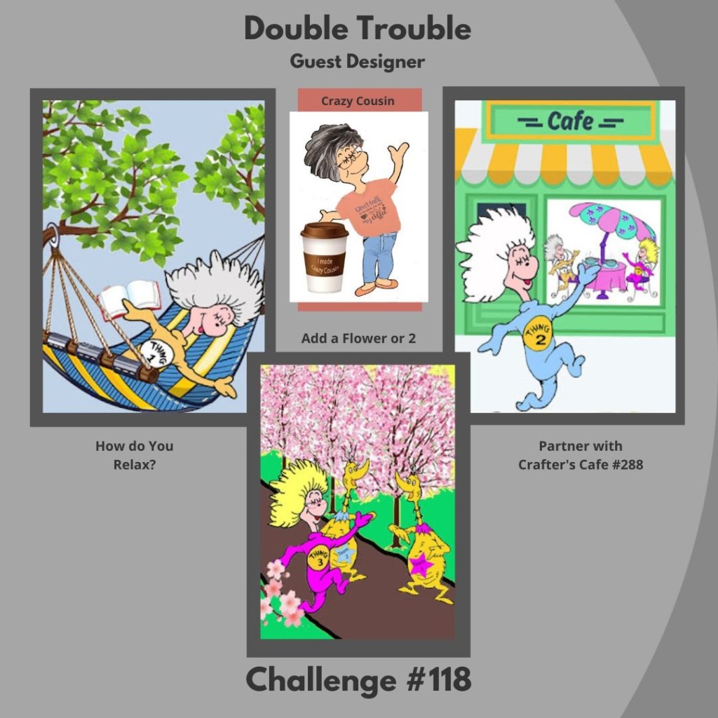 The current challenge is celebrating National Relaxation Day. How do you chill? Me? Give me a good friend and a cup of tea and I am good to stay put for a long while! Doesn’t the Crafter’s Café look like an ideal place? Double Trouble is partnering with the Café (#288) this round.