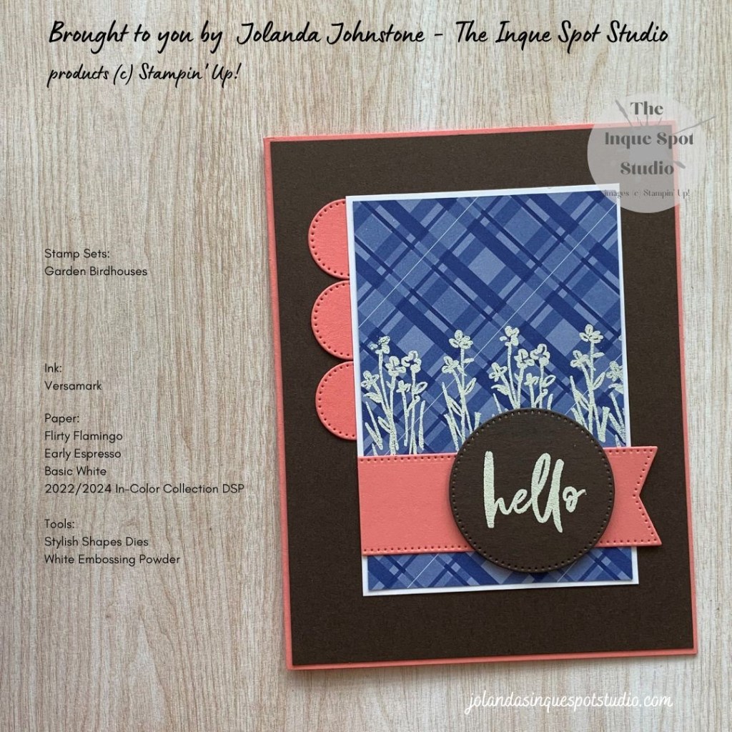 A challenging combination of colors and I opted to feature the Early Espresso and pop it up with the Flirty Flamingo. The patterned paper color, Starry Sky, acts as a nice foil for the little white flowers for friendly Hello card.