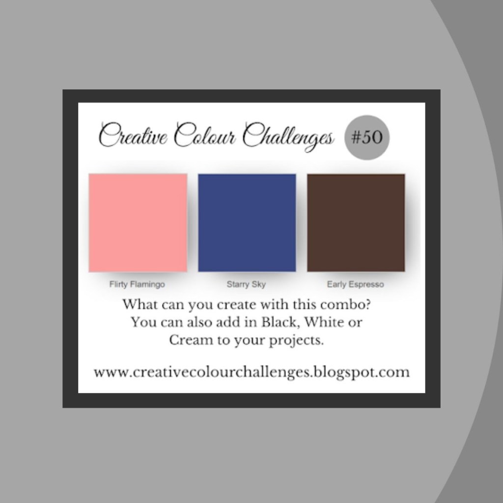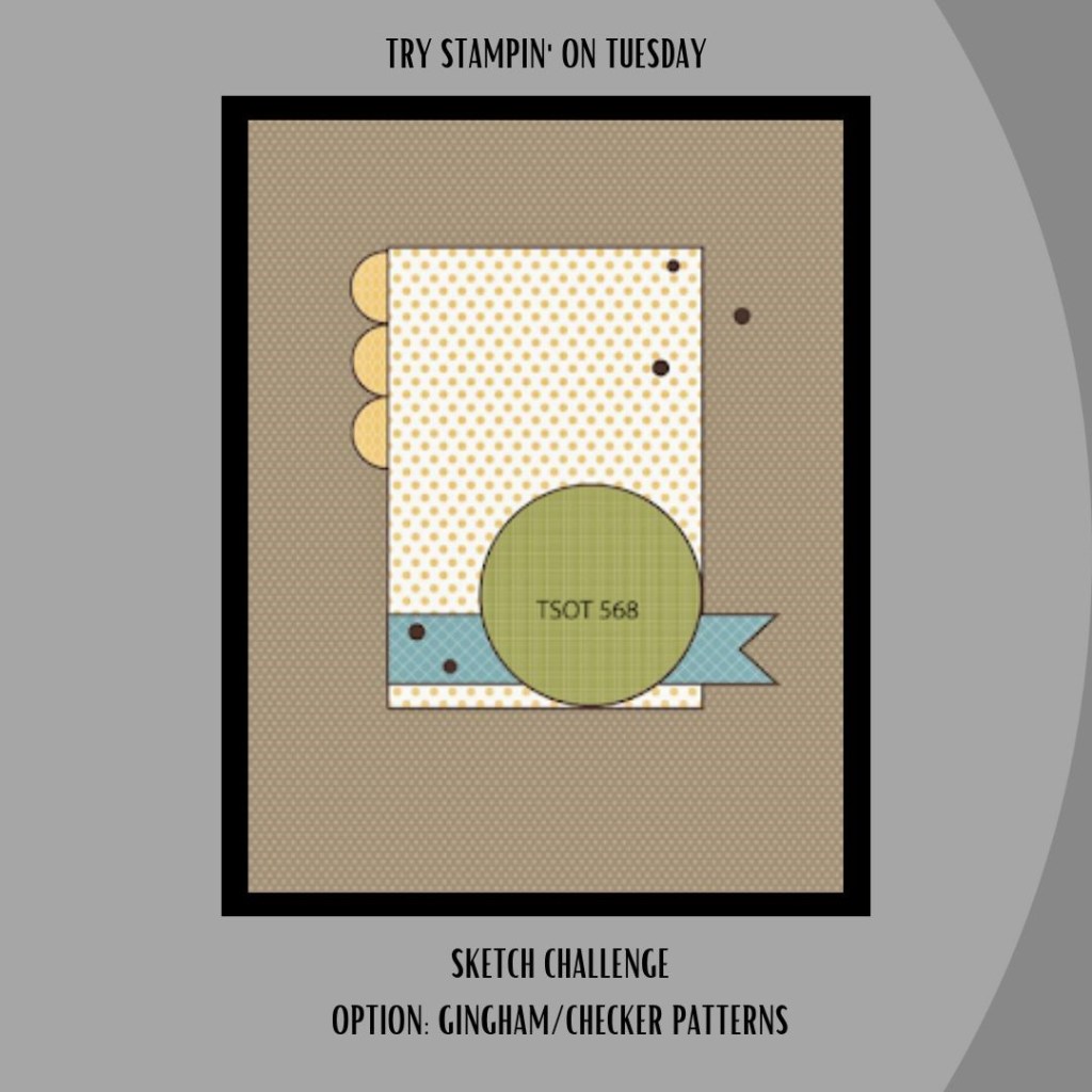 Working with the Try Stampin’ On Tuesday Sketch (#568), the Colors suggested by Creative Colour Challenges (#50) and picking up two elements from the Just Add Ink (#617) Choose Two Challenge.