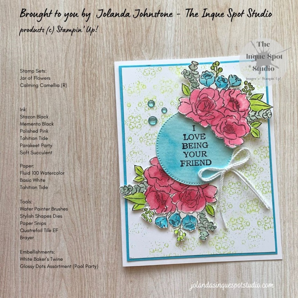 - The sentiment, I love being your friend, from the retired Calming Camellia stamp set was stamped with Memento Tuxedo Black ink.