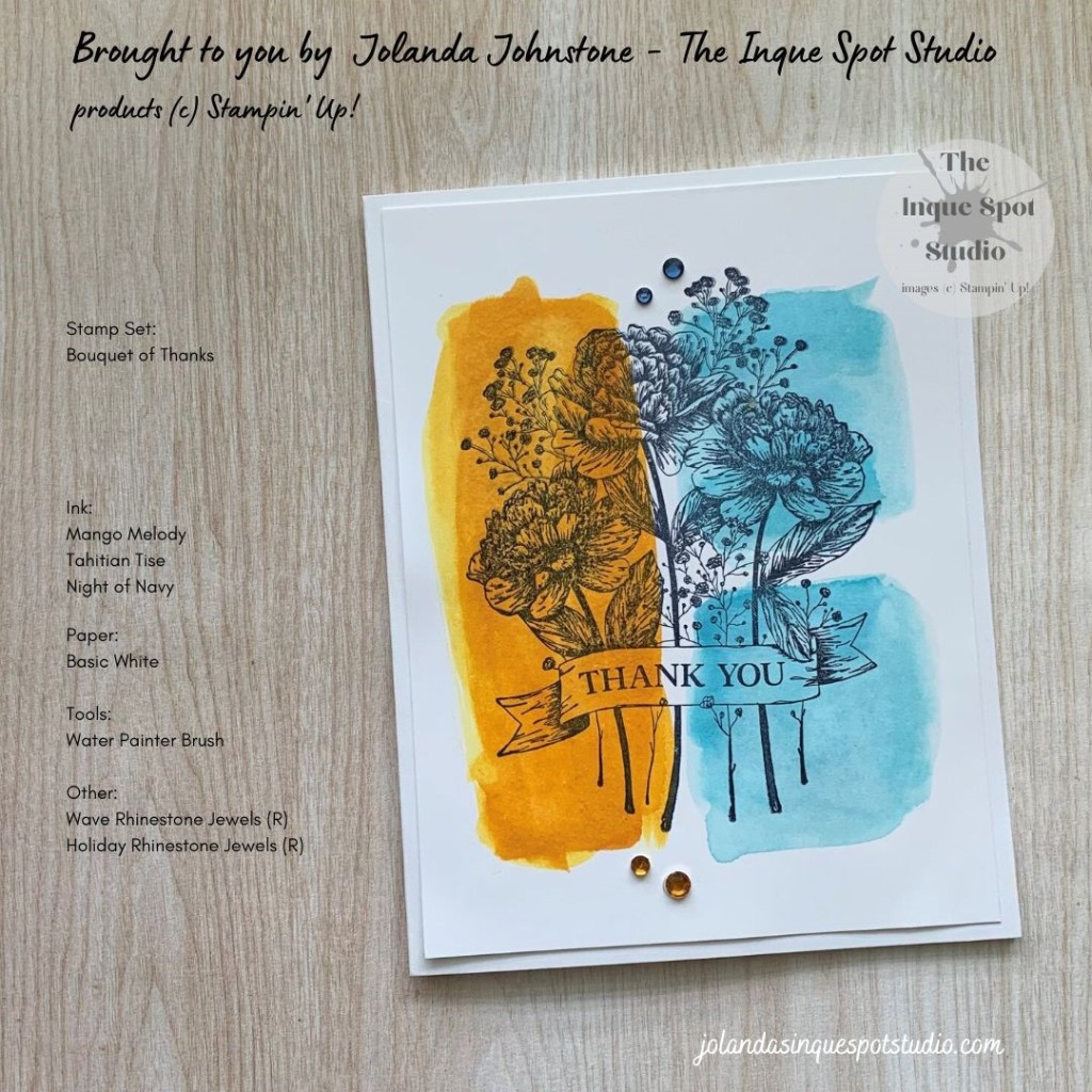 • Focal Image: Bouquet of Thanks stamp was stamped with Night of Navy ink over the water-colored shapes.
