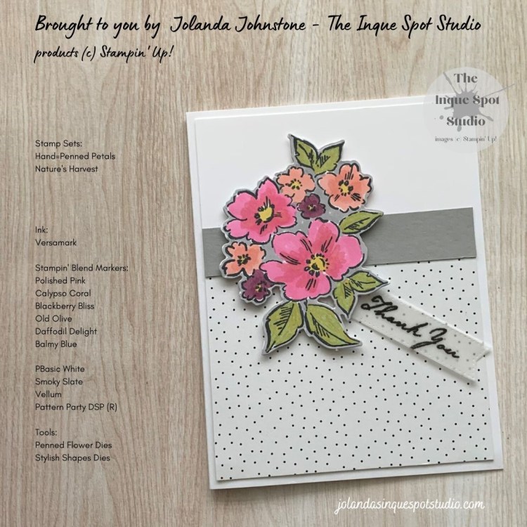 - The Floral Spray image from the Hand-Penned Petals stamp set was stamped with Memento Tuxedo Black ink and colored with a variety of Stampin’ Blend Markers. Large Flowers: Light Polished Pink with Light Calypso Coral, Medium Flowers: Light Calypso Coral, Small Flowers: Light Blackberrry Bliss, Flower Centers: Light Daffodil Delight and Leaves: a mix of Light Old Olive, Light Daffodil Delight and Light Balmy Blue.